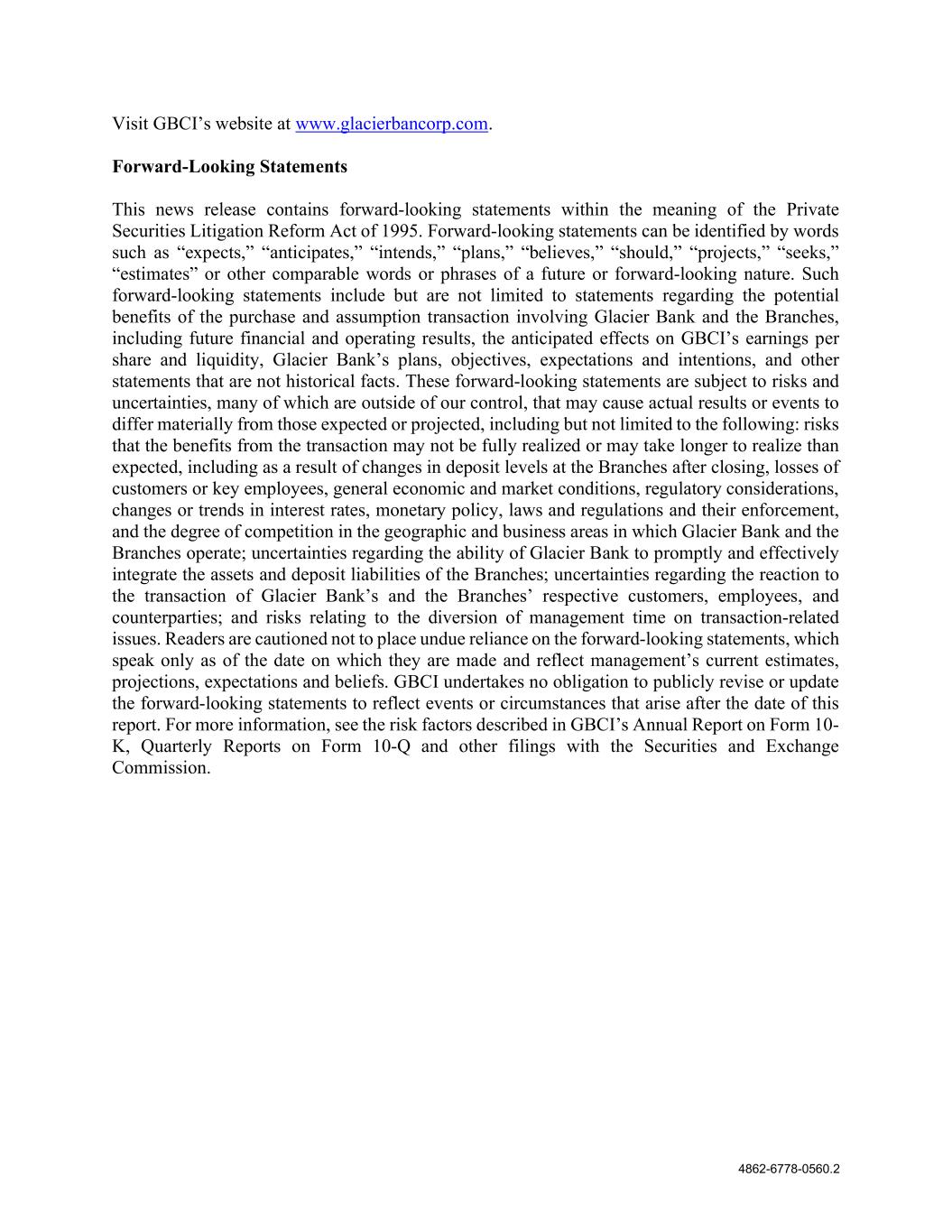 4862-6778-0560.2 Visit GBCI’s website at www.glacierbancorp.com. Forward-Looking Statements This news release contains forward-looking statements within the meaning of the Private Securities Litigation Reform Act of 1995. Forward-looking statements can be identified by words such as “expects,” “anticipates,” “intends,” “plans,” “believes,” “should,” “projects,” “seeks,” “estimates” or other comparable words or phrases of a future or forward-looking nature. Such forward-looking statements include but are not limited to statements regarding the potential benefits of the purchase and assumption transaction involving Glacier Bank and the Branches, including future financial and operating results, the anticipated effects on GBCI’s earnings per share and liquidity, Glacier Bank’s plans, objectives, expectations and intentions, and other statements that are not historical facts. These forward-looking statements are subject to risks and uncertainties, many of which are outside of our control, that may cause actual results or events to differ materially from those expected or projected, including but not limited to the following: risks that the benefits from the transaction may not be fully realized or may take longer to realize than expected, including as a result of changes in deposit levels at the Branches after closing, losses of customers or key employees, general economic and market conditions, regulatory considerations, changes or trends in interest rates, monetary policy, laws and regulations and their enforcement, and the degree of competition in the geographic and business areas in which Glacier Bank and the Branches operate; uncertainties regarding the ability of Glacier Bank to promptly and effectively integrate the assets and deposit liabilities of the Branches; uncertainties regarding the reaction to the transaction of Glacier Bank’s and the Branches’ respective customers, employees, and counterparties; and risks relating to the diversion of management time on transaction-related issues. Readers are cautioned not to place undue reliance on the forward-looking statements, which speak only as of the date on which they are made and reflect management’s current estimates, projections, expectations and beliefs. GBCI undertakes no obligation to publicly revise or update the forward-looking statements to reflect events or circumstances that arise after the date of this report. For more information, see the risk factors described in GBCI’s Annual Report on Form 10- K, Quarterly Reports on Form 10-Q and other filings with the Securities and Exchange Commission.