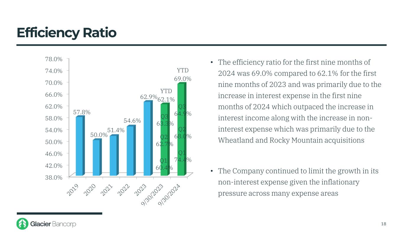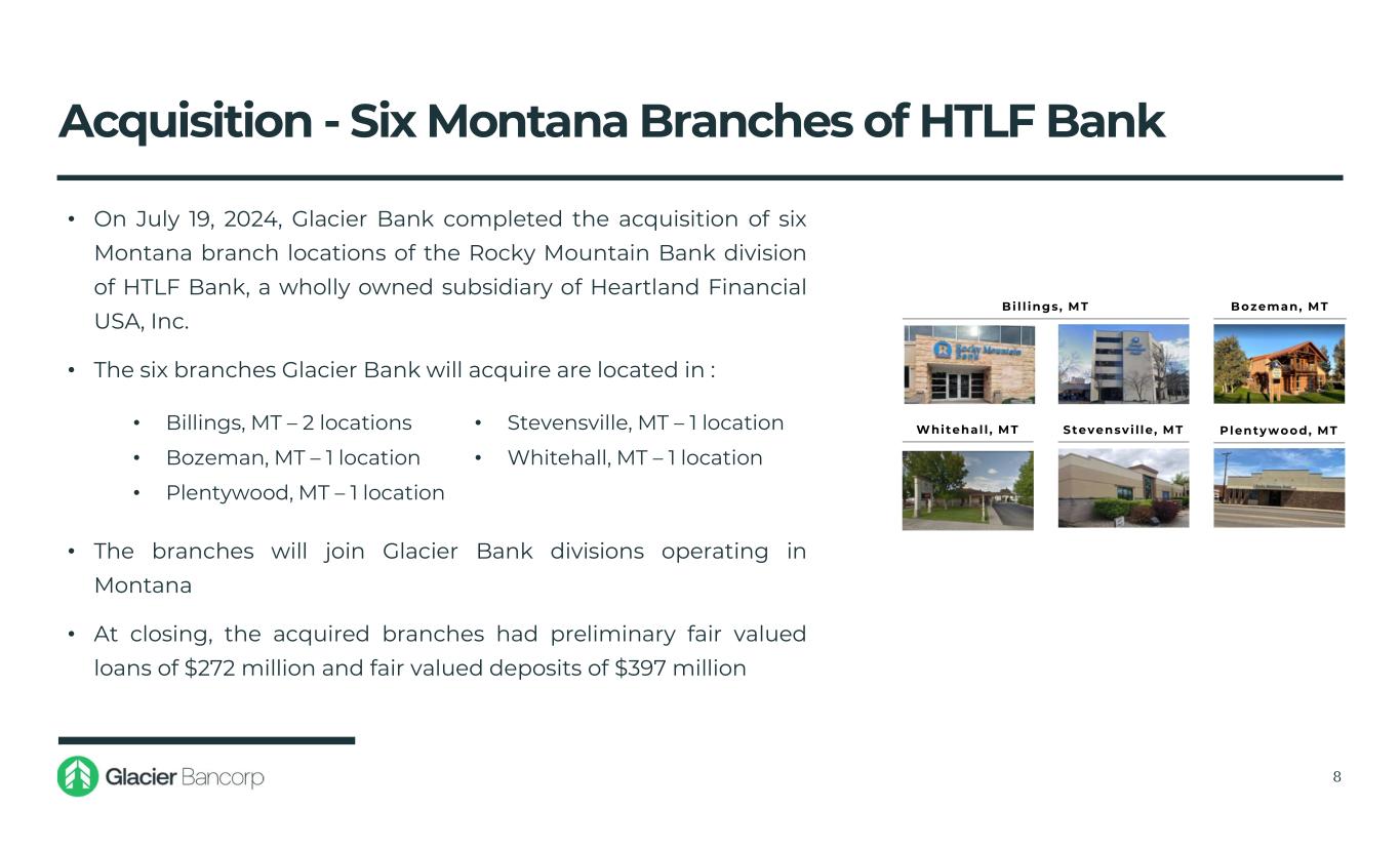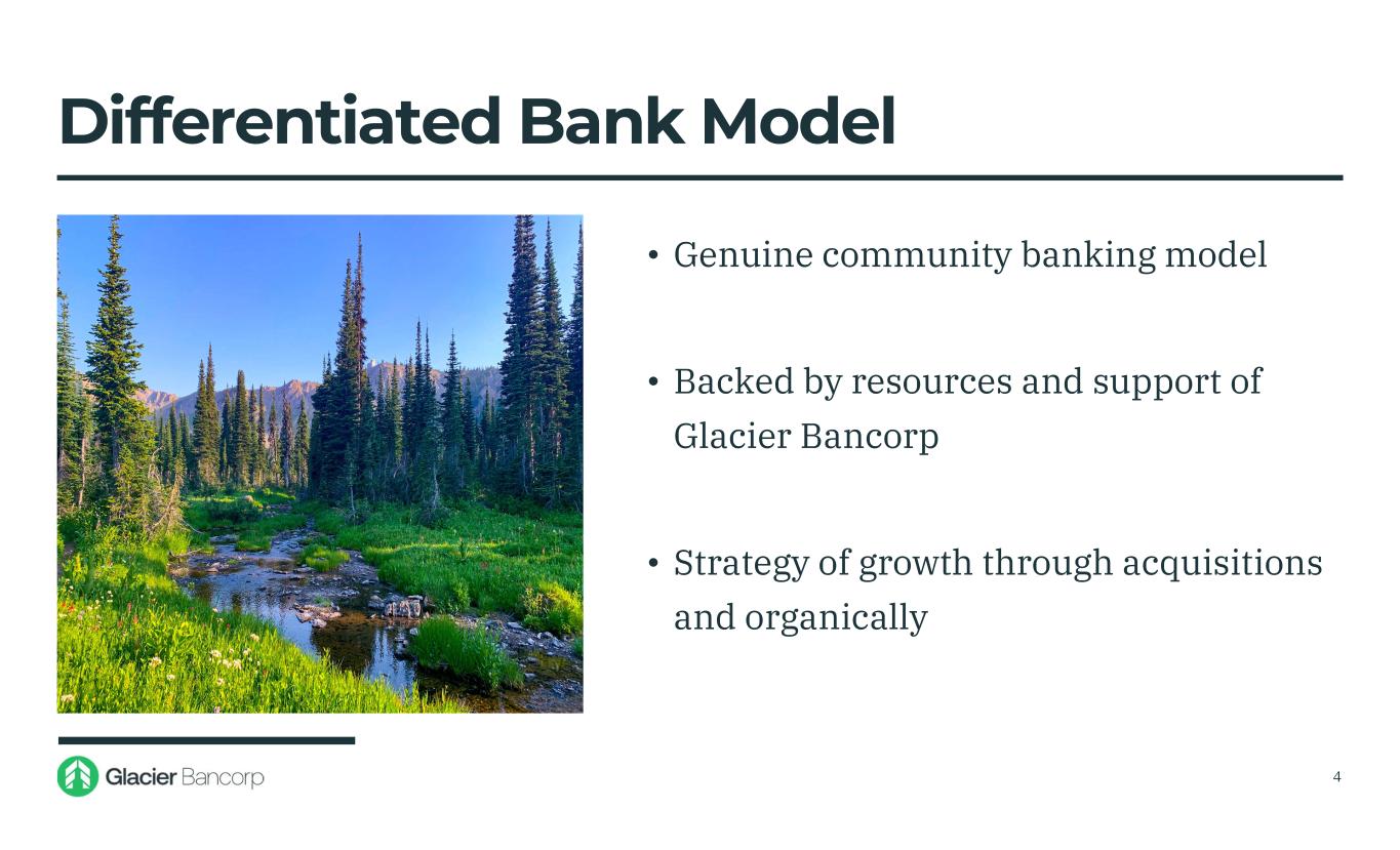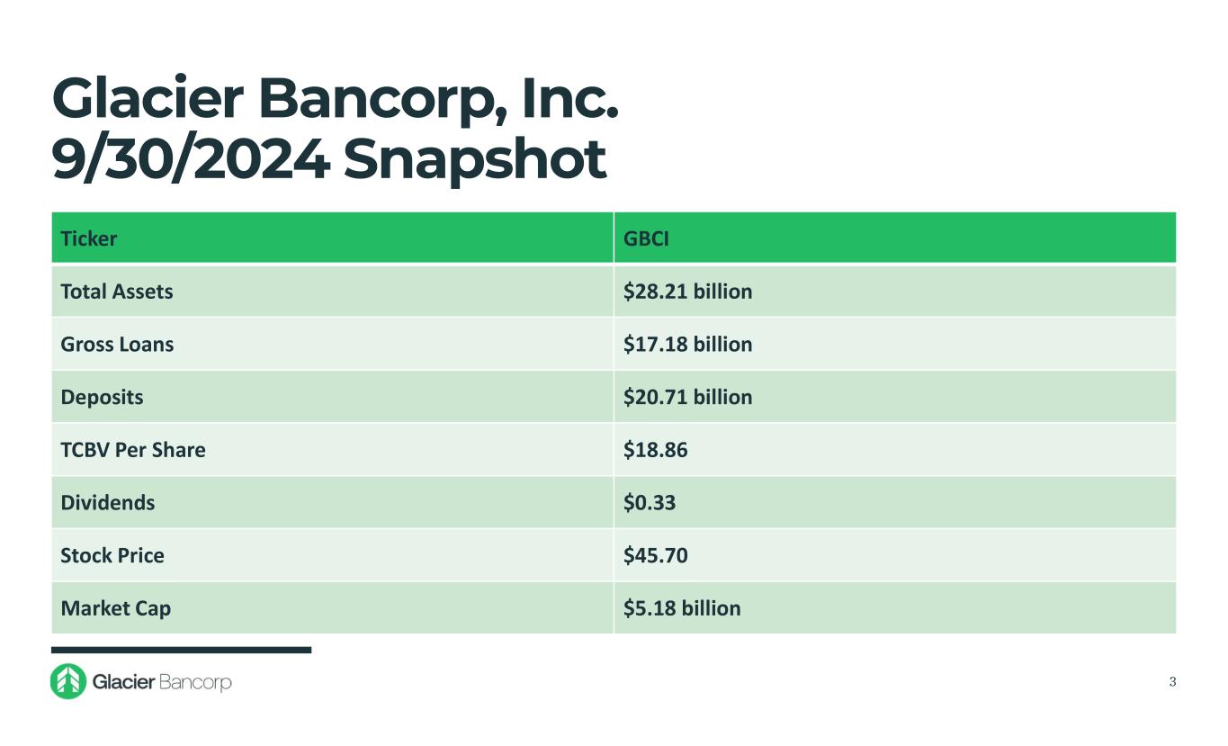 Forward-Looking Statements This presentation contains forward-looking statements within the meaning of the Private Securities Litigation Reform Act of 1995. These forward-looking statements include, but are not limited to, statements about the Company’s plans, objectives, expectations and intentions that are not historical facts, and other statements identified by words such as “expects,” “anticipates,” “intends,” “plans,” “believes,” “should,” “projects,” “seeks,” “estimates” or other comparable words or phrases of a future or forward-looking nature. These forward-looking statements are based on current beliefs and expectations of management and are inherently subject to significant business, economic and competitive uncertainties and contingencies, many of which are beyond the Company’s control. In addition, these forward-looking statements are based on assumptions that are subject to change. The following factors, among others, could cause actual results to differ materially from the anticipated results (express or implied) or other expectations in the forward-looking statements: 1) Risks associated with lending and potential adverse changes in the credit quality of the Company’s loan portfolio; 2) Changes in monetary and fiscal policies, including interest rate policies of the Federal Reserve Board, which could adversely affect the Company’s net interest income and margin, the fair value of its financial instruments, profitability, and stockholders’ equity; 3) Legislative or regulatory changes, including increased FDIC insurance rates and assessments, changes in the review and regulation of bank mergers, or increased banking and consumer protection regulations, that may adversely affect the Company’s business and strategies; 4) Risks related to overall economic conditions, including the impact on the economy of a rising interest rate environment, inflationary pressures, and geopolitical instability, including the wars in Ukraine and the Middle East; 5) Risks associated with the Company’s ability to negotiate, complete, and successfully integrate any future acquisitions; 6) Costs or difficulties related to the completion and integration of pending or future acquisitions; 7) Impairment of the goodwill recorded by the Company in connection with acquisitions, which may have an adverse impact on earnings and capital; 8) Reduction in demand for banking products and services, whether as a result of changes in customer behavior, economic conditions, banking environment, or competition; 9) Deterioration of the reputation of banks and the financial services industry, which could adversely affect the Company's ability to obtain and maintain customers; 10) Changes in the competitive landscape, including as may result from new market entrants or further consolidation in the financial services industry, resulting in the creation of larger competitors with greater financial resources; 11) Risks presented by continued public stock market volatility, which could adversely affect the market price of the Company’s common stock and the ability to raise additional capital or grow through acquisitions; 12) Risks associated with dependence on the Chief Executive Officer, the senior management team and the Presidents of Glacier Bank’s divisions; 13) Material failure, potential interruption or breach in security of the Company’s systems or changes in technological which could expose the Company to cybersecurity risks, fraud, system failures, or direct liabilities; 14) Risks related to natural disasters, including droughts, fires, floods, earthquakes, pandemics, and other unexpected events; 15) Success in managing risks involved in the foregoing; and 16) Effects of any reputational damage to the Company resulting from any of the foregoing. 2