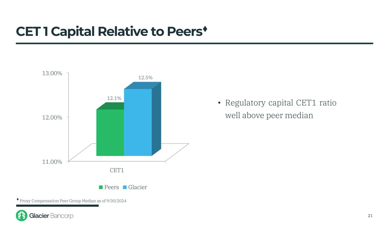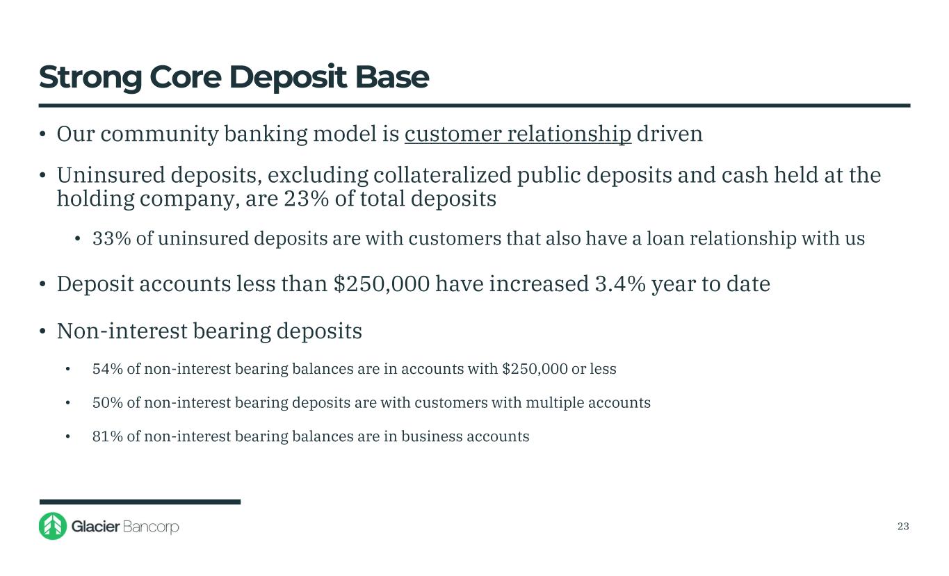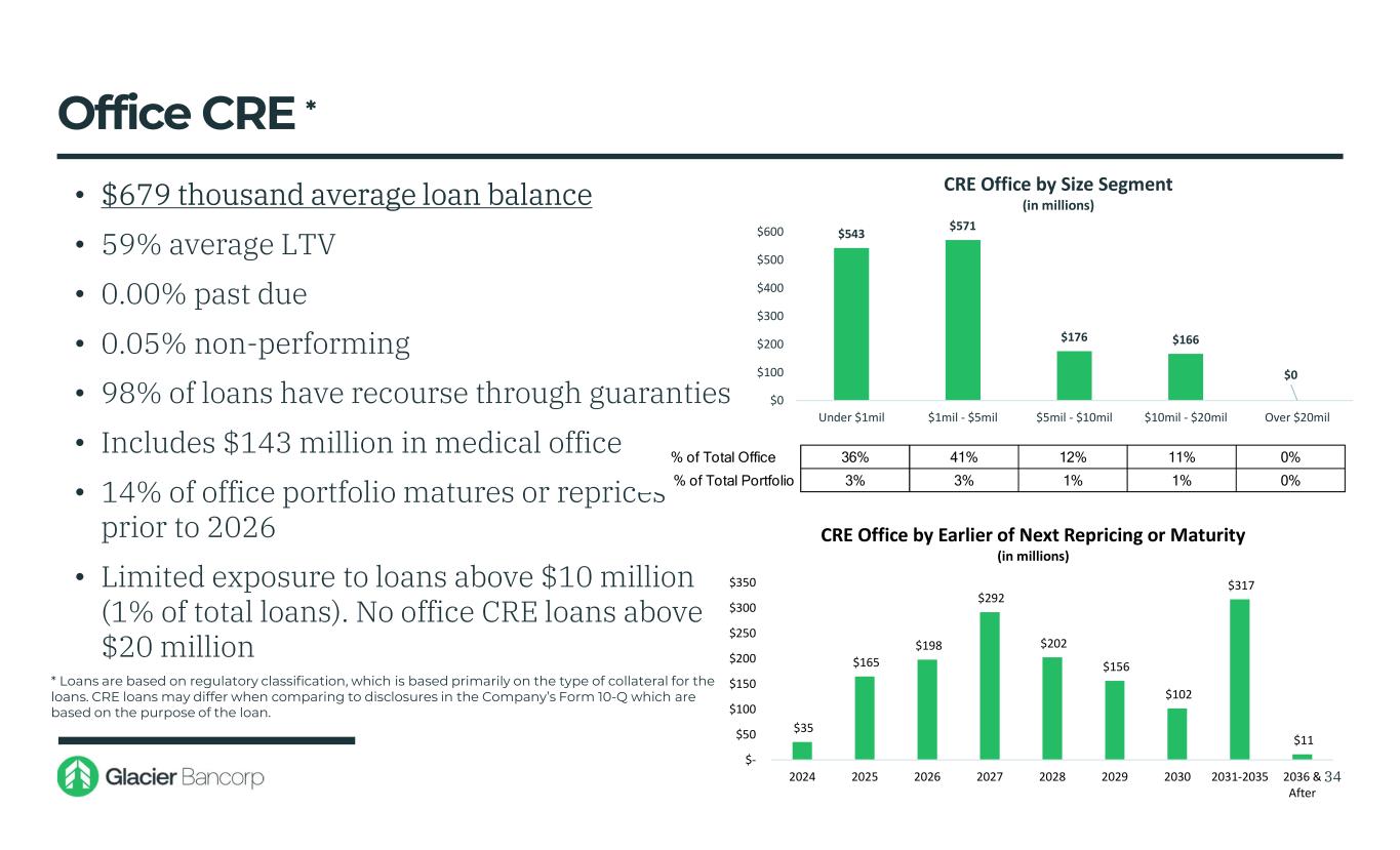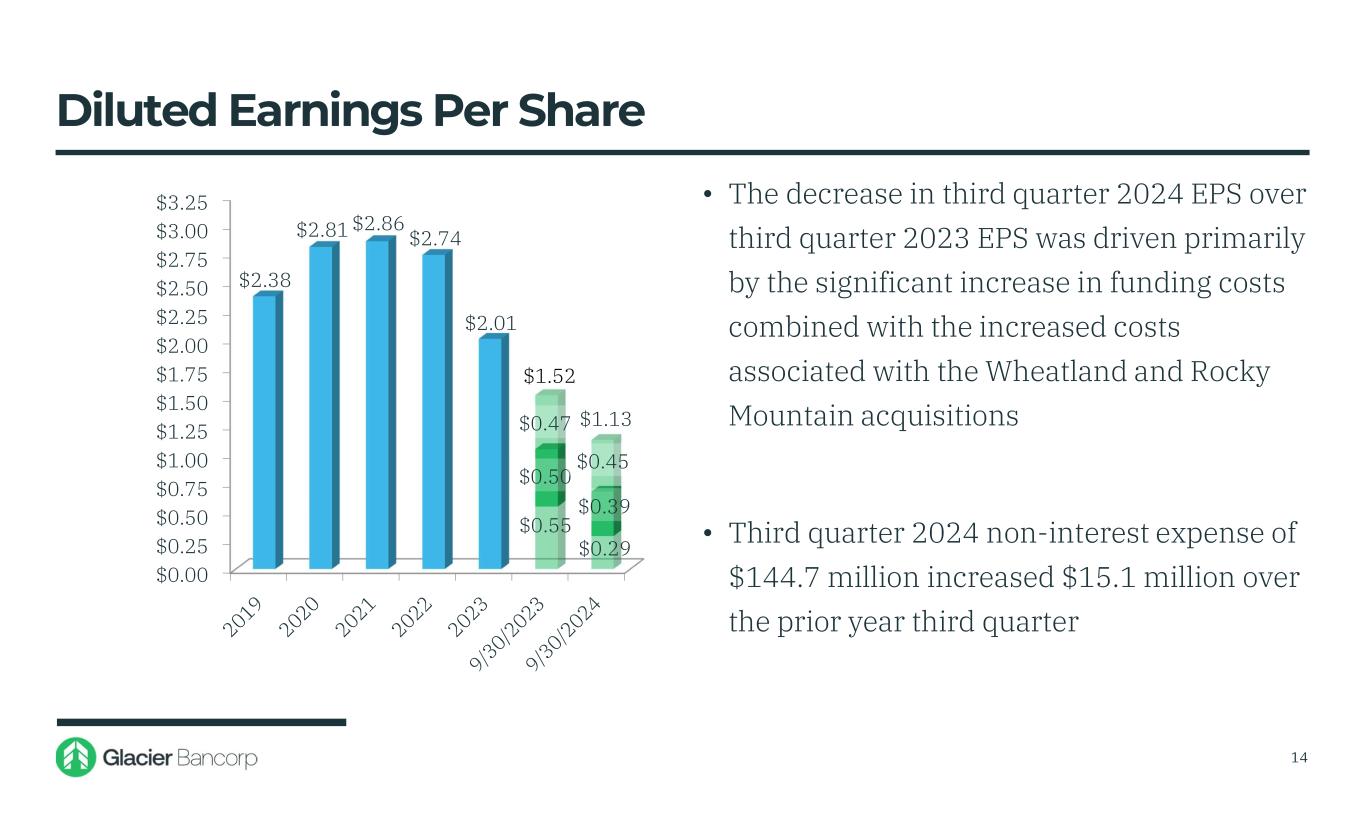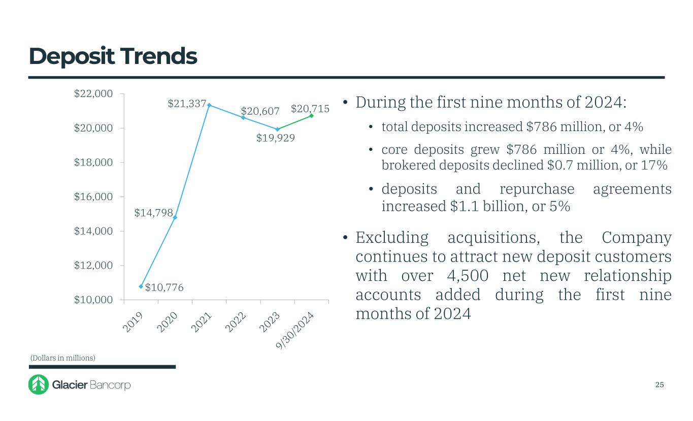 Forward-Looking Statements This presentation contains forward-looking statements within the meaning of the Private Securities Litigation Reform Act of 1995. These forward-looking statements include, but are not limited to, statements about the Company’s plans, objectives, expectations and intentions that are not historical facts, and other statements identified by words such as “expects,” “anticipates,” “intends,” “plans,” “believes,” “should,” “projects,” “seeks,” “estimates” or other comparable words or phrases of a future or forward-looking nature. These forward-looking statements are based on current beliefs and expectations of management and are inherently subject to significant business, economic and competitive uncertainties and contingencies, many of which are beyond the Company’s control. In addition, these forward-looking statements are based on assumptions that are subject to change. The following factors, among others, could cause actual results to differ materially from the anticipated results (express or implied) or other expectations in the forward-looking statements: 1) Risks associated with lending and potential adverse changes in the credit quality of the Company’s loan portfolio; 2) Changes in monetary and fiscal policies, including interest rate policies of the Federal Reserve Board, which could adversely affect the Company’s net interest income and margin, the fair value of its financial instruments, profitability, and stockholders’ equity; 3) Legislative or regulatory changes, including increased FDIC insurance rates and assessments, changes in the review and regulation of bank mergers, or increased banking and consumer protection regulations, that may adversely affect the Company’s business and strategies; 4) Risks related to overall economic conditions, including the impact on the economy of a rising interest rate environment, inflationary pressures, and geopolitical instability, including the wars in Ukraine and the Middle East; 5) Risks associated with the Company’s ability to negotiate, complete, and successfully integrate any future acquisitions; 6) Costs or difficulties related to the completion and integration of pending or future acquisitions; 7) Impairment of the goodwill recorded by the Company in connection with acquisitions, which may have an adverse impact on earnings and capital; 8) Reduction in demand for banking products and services, whether as a result of changes in customer behavior, economic conditions, banking environment, or competition; 9) Deterioration of the reputation of banks and the financial services industry, which could adversely affect the Company's ability to obtain and maintain customers; 10) Changes in the competitive landscape, including as may result from new market entrants or further consolidation in the financial services industry, resulting in the creation of larger competitors with greater financial resources; 11) Risks presented by continued public stock market volatility, which could adversely affect the market price of the Company’s common stock and the ability to raise additional capital or grow through acquisitions; 12) Risks associated with dependence on the Chief Executive Officer, the senior management team and the Presidents of Glacier Bank’s divisions; 13) Material failure, potential interruption or breach in security of the Company’s systems or changes in technological which could expose the Company to cybersecurity risks, fraud, system failures, or direct liabilities; 14) Risks related to natural disasters, including droughts, fires, floods, earthquakes, pandemics, and other unexpected events; 15) Success in managing risks involved in the foregoing; and 16) Effects of any reputational damage to the Company resulting from any of the foregoing. 2