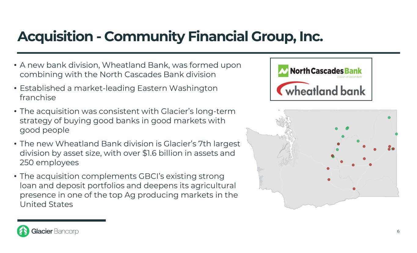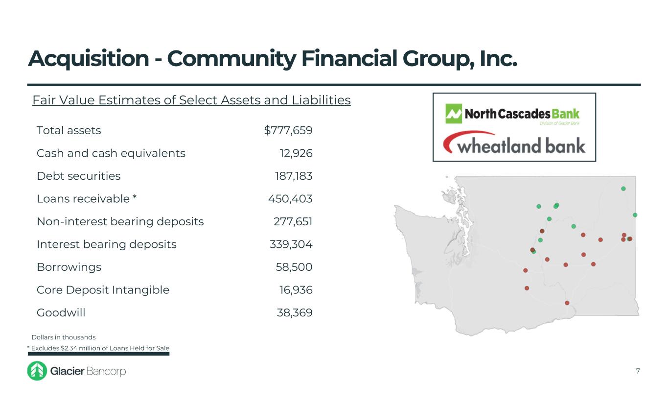 Acquisition - Community Financial Group, Inc. • A new bank division, Wheatland Bank, was formed upon combining with the North Cascades Bank division • Established a market-leading Eastern Washington franchise • The acquisition was consistent with Glacier’s long-term strategy of buying good banks in good markets with good people • The new Wheatland Bank division is Glacier’s 7th largest division by asset size, with over $1.6 billion in assets and 250 employees • The acquisition complements GBCI’s existing strong loan and deposit portfolios and deepens its agricultural presence in one of the top Ag producing markets in the United States 6