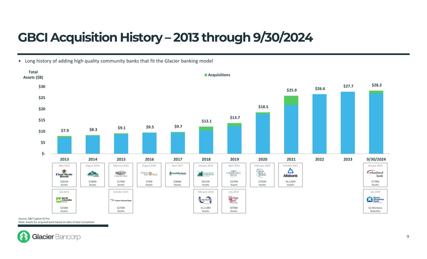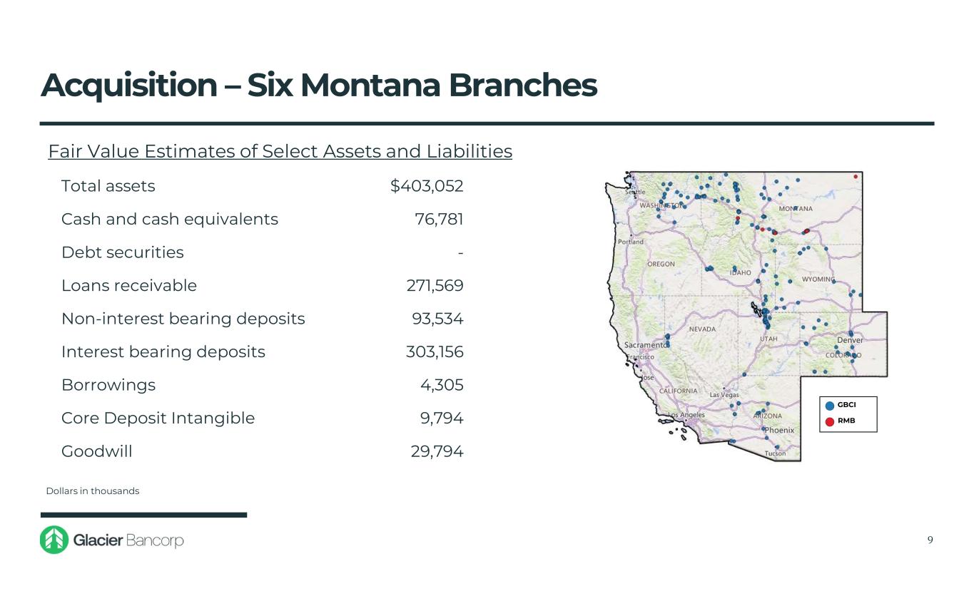 Acquisition - Six Montana Branches of HTLF Bank 8 • On July 19, 2024, Glacier Bank completed the acquisition of six Montana branch locations of the Rocky Mountain Bank division of HTLF Bank, a wholly owned subsidiary of Heartland Financial USA, Inc. • The six branches Glacier Bank will acquire are located in : • The branches will join Glacier Bank divisions operating in Montana • At closing, the acquired branches had preliminary fair valued loans of $272 million and fair valued deposits of $397 million • Billings, MT – 2 locations • Stevensville, MT – 1 location • Bozeman, MT – 1 location • Whitehall, MT – 1 location • Plentywood, MT – 1 location Stevensvi l le , MT Plentywood, MTWhitehal l , MT Bozeman, MTBi l l ings, MT