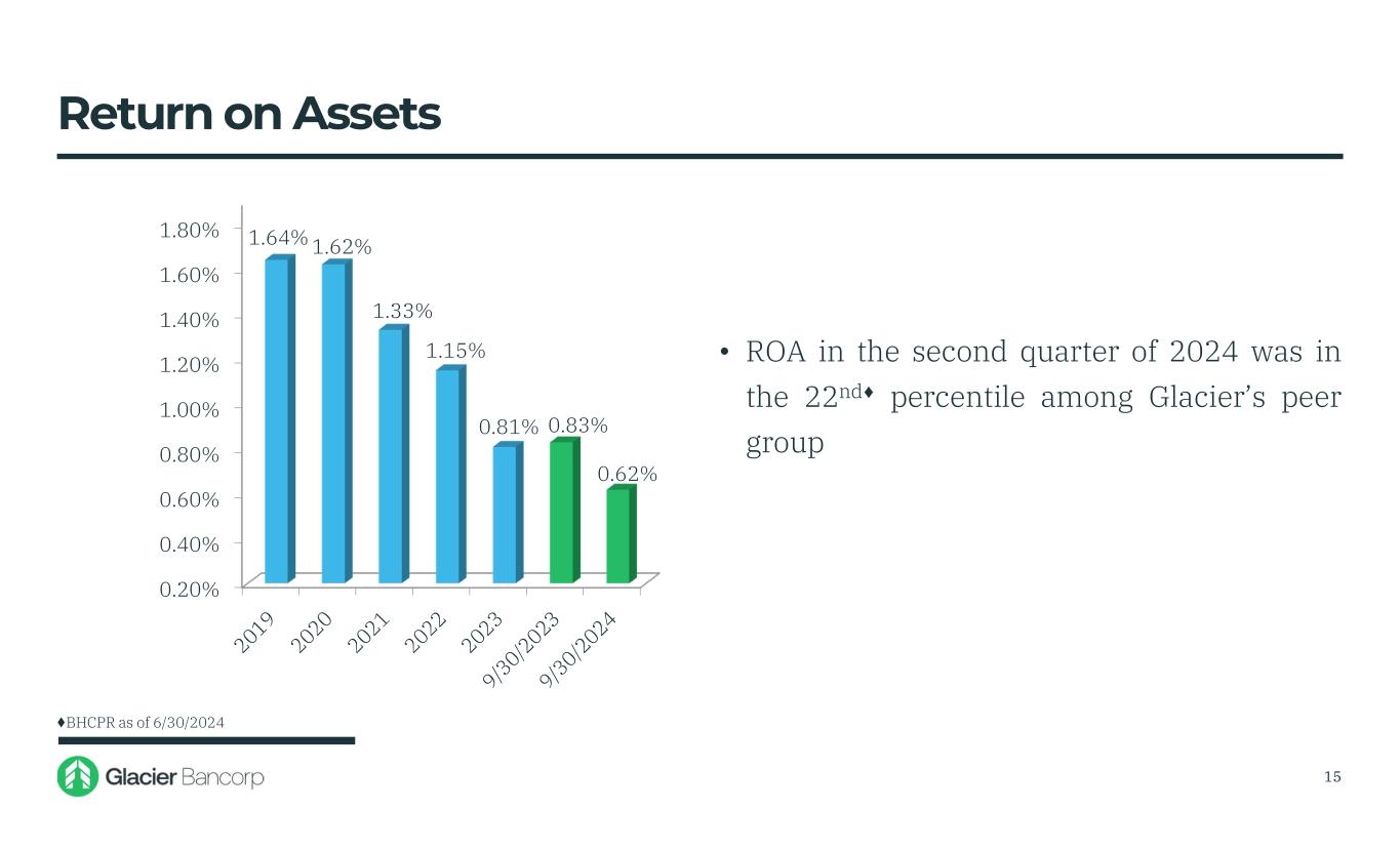 14 Diluted Earnings Per Share $0.00 $0.25 $0.50 $0.75 $1.00 $1.25 $1.50 $1.75 $2.00 $2.25 $2.50 $2.75 $3.00 $3.25 $2.38 $2.81 $2.01 $0.55 $0.29 $0.50 $0.39 $0.47 $0.45 $2.74 $1.52 • The decrease in third quarter 2024 EPS over third quarter 2023 EPS was driven primarily by the significant increase in funding costs combined with the increased costs associated with the Wheatland and Rocky Mountain acquisitions • Third quarter 2024 non-interest expense of $144.7 million increased $15.1 million over the prior year third quarter $2.86 $1.13