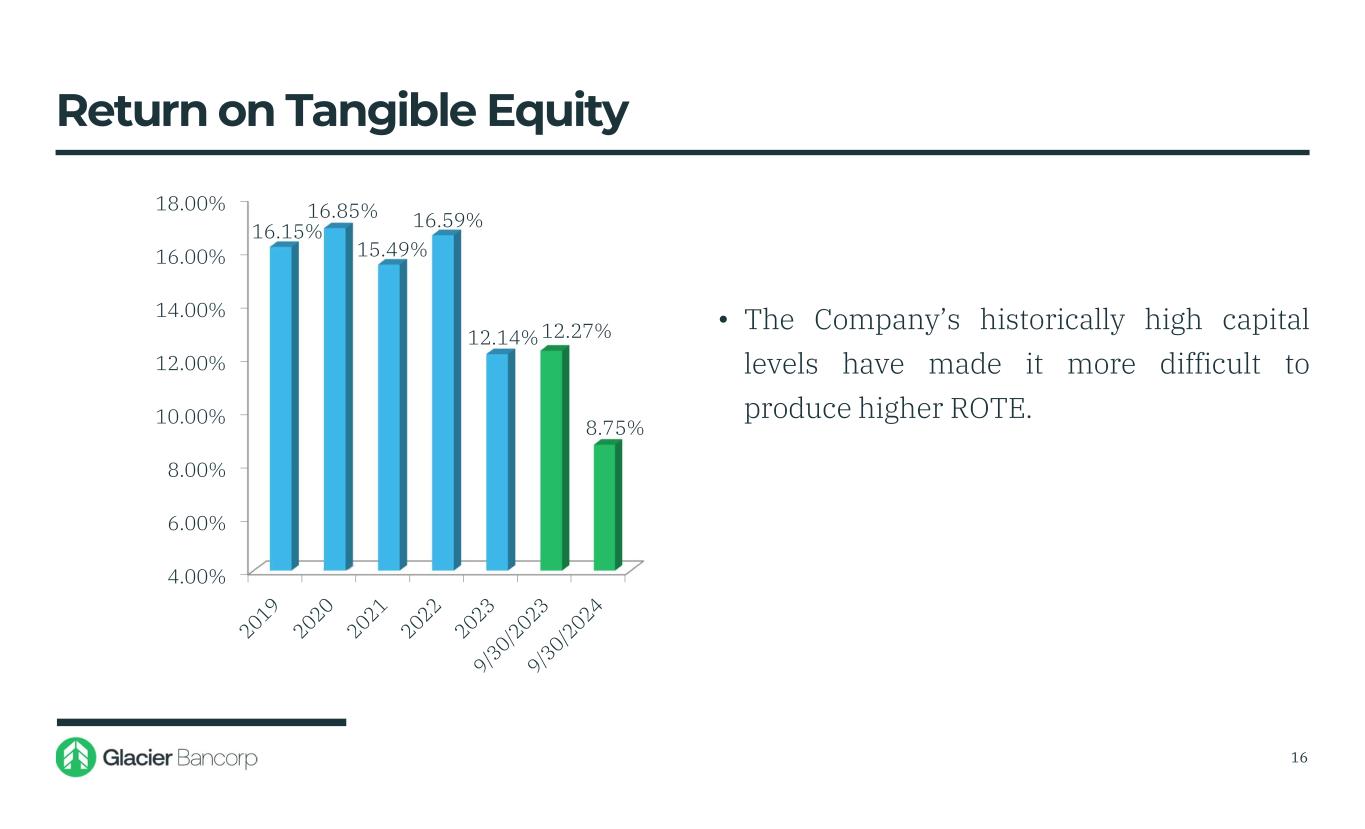0.20% 0.40% 0.60% 0.80% 1.00% 1.20% 1.40% 1.60% 1.80% 1.62%1.64% 1.33% 0.81% 0.83% 0.62% • ROA in the second quarter of 2024 was in the 22nd♦ percentile among Glacier’s peer group 15 Return on Assets ♦BHCPR as of 6/30/2024 1.15%
