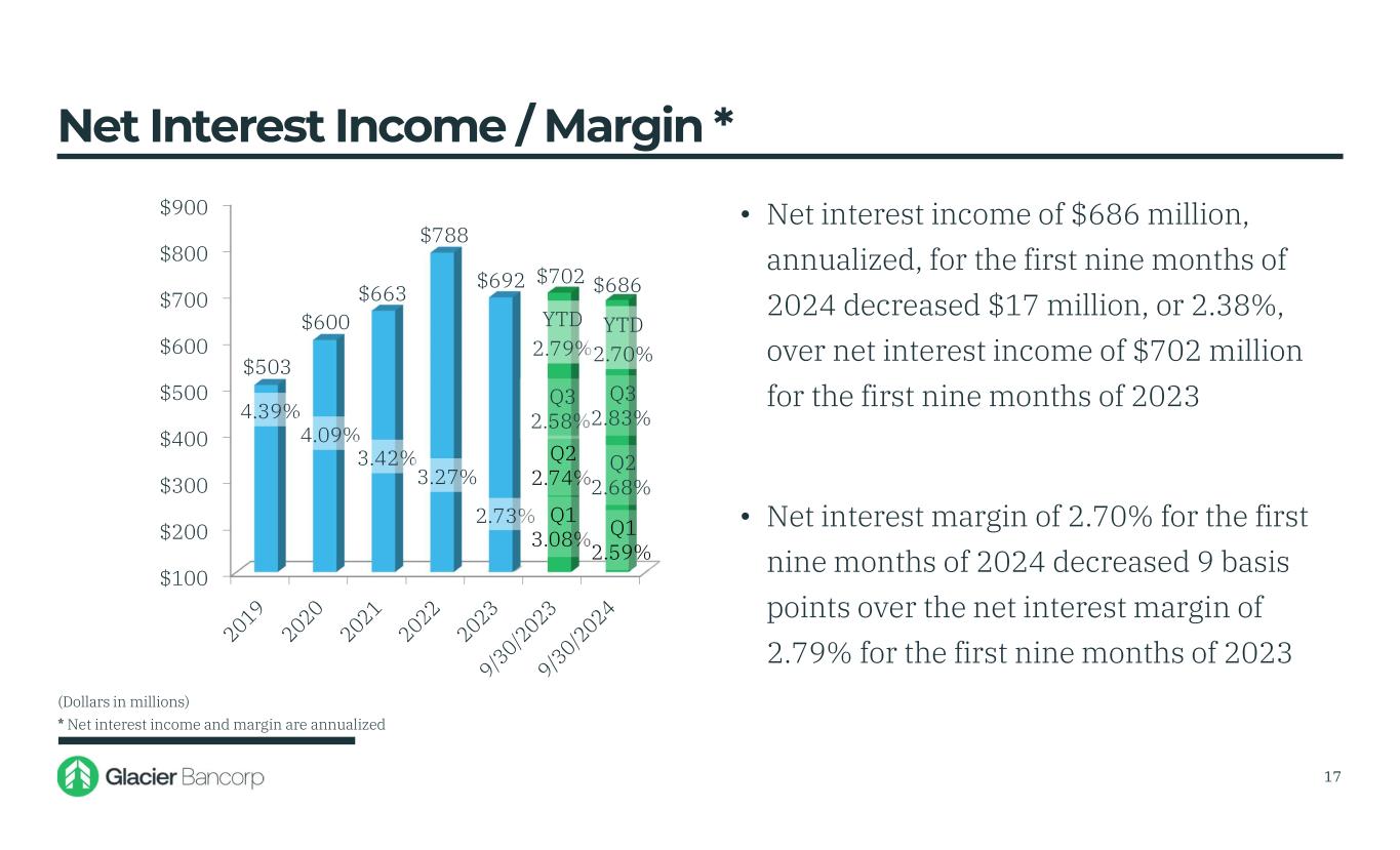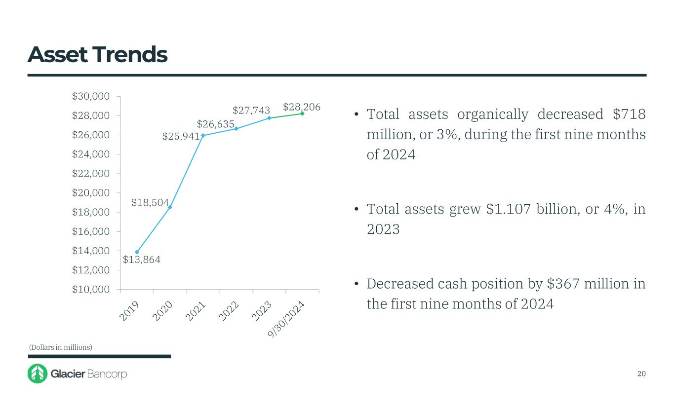 Glacier Bancorp, Inc. 9/30/2024 Snapshot Ticker GBCI Total Assets $28.21 billion Gross Loans $17.18 billion Deposits $20.71 billion TCBV Per Share $18.86 Dividends $0.33 Stock Price $45.70 Market Cap $5.18 billion 3
