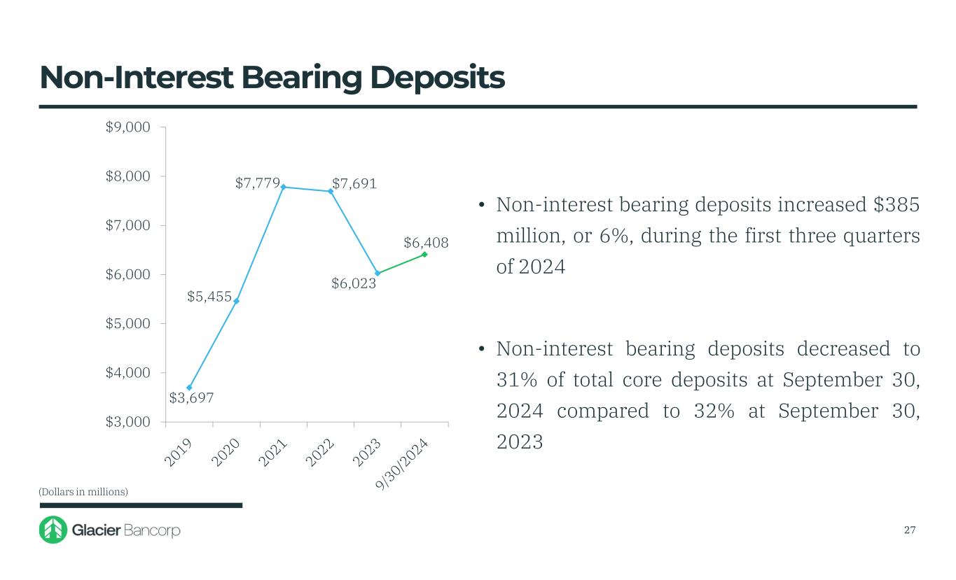 Non- Interest Bearing 32% NOW and DDA 26% Savings 14% MMDA 15% CDs 13% Wholesale 0% 9/30/2023 Non- Interest Bearing 31% NOW and DDA 26% Savings 13% MMDA 14% CDs 16% Wholesale 0% 9/30/2024 26 Deposit Composition
