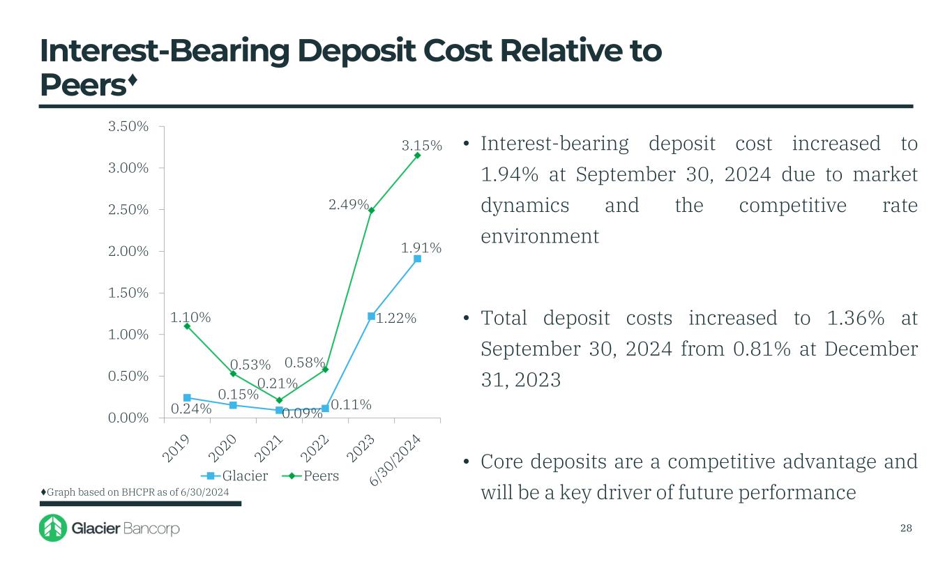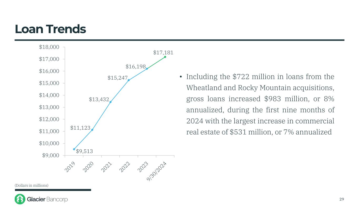 0.24% 0.15% 0.09% 0.11% 1.22% 1.91% 1.10% 0.53% 0.21% 0.58% 2.49% 3.15% 0.00% 0.50% 1.00% 1.50% 2.00% 2.50% 3.00% 3.50% Glacier Peers • Interest-bearing deposit cost increased to 1.94% at September 30, 2024 due to market dynamics and the competitive rate environment • Total deposit costs increased to 1.36% at September 30, 2024 from 0.81% at December 31, 2023 • Core deposits are a competitive advantage and will be a key driver of future performance 28 Interest-Bearing Deposit Cost Relative to Peers♦ ♦Graph based on BHCPR as of 6/30/2024