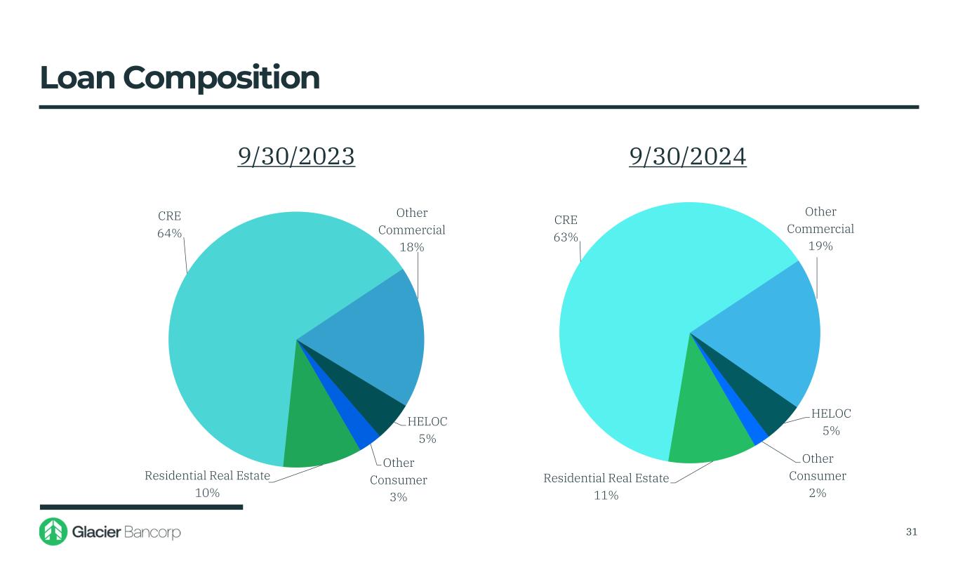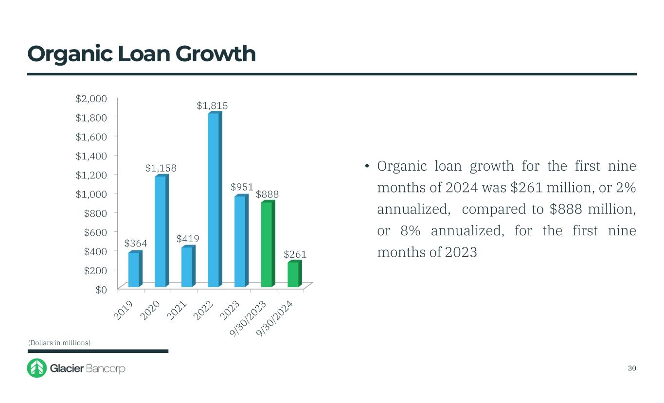 $9,513 $11,123 $13,432 $15,247 $16,198 $17,181 $9,000 $10,000 $11,000 $12,000 $13,000 $14,000 $15,000 $16,000 $17,000 $18,000 • Including the $722 million in loans from the Wheatland and Rocky Mountain acquisitions, gross loans increased $983 million, or 8% annualized, during the first nine months of 2024 with the largest increase in commercial real estate of $531 million, or 7% annualized 29 Loan Trends (Dollars in millions)