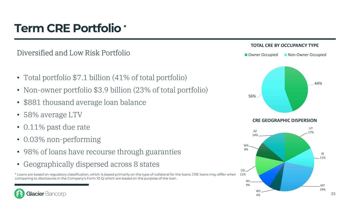 Montana 62% Idaho 22% Utah 2% Washington 1% Wyoming 9% Colorado 4% 12/31/2009 Montana 34% Idaho 13%Utah 15% Washington 8% Wyoming 8% Colorado 9% Arizona 9% Nevada 4% 9/30/2024 32 Geographic Loan Dispersion
