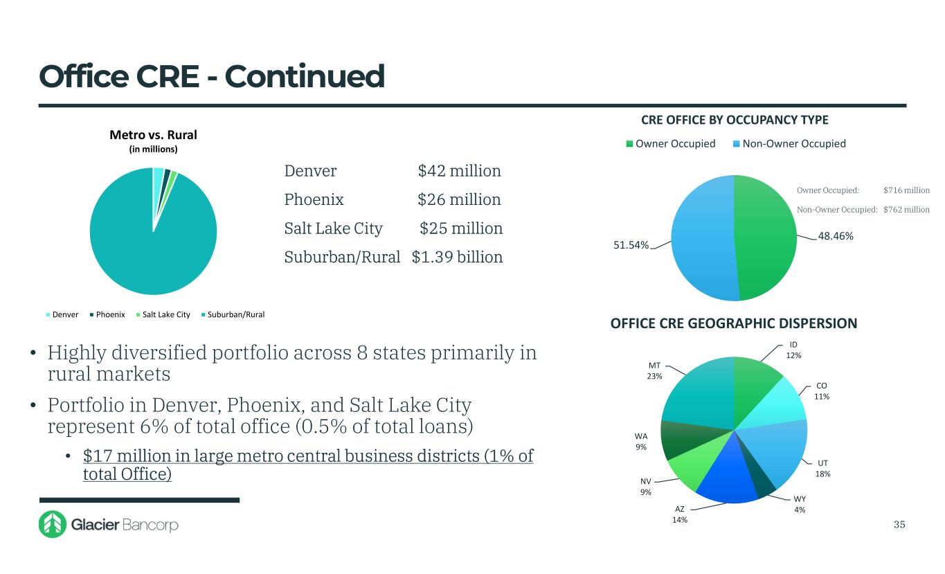 Office CRE * • $679 thousand average loan balance • 59% average LTV • 0.00% past due • 0.05% non-performing • 98% of loans have recourse through guaranties • Includes $143 million in medical office • 14% of office portfolio matures or reprices prior to 2026 • Limited exposure to loans above $10 million (1% of total loans). No office CRE loans above $20 million 34 $543 $571 $176 $166 $0 $0 $100 $200 $300 $400 $500 $600 Under $1mil $1mil - $5mil $5mil - $10mil $10mil - $20mil Over $20mil CRE Office by Size Segment (in millions) $35 $165 $198 $292 $202 $156 $102 $317 $11 $- $50 $100 $150 $200 $250 $300 $350 2024 2025 2026 2027 2028 2029 2030 2031-2035 2036 & After CRE Office by Earlier of Next Repricing or Maturity (in millions) % of Total Office 36% 41% 12% 11% 0% % of Total Portfolio 3% 3% 1% 1% 0% * Loans are based on regulatory classification, which is based primarily on the type of collateral for the loans. CRE loans may differ when comparing to disclosures in the Company’s Form 10-Q which are based on the purpose of the loan.