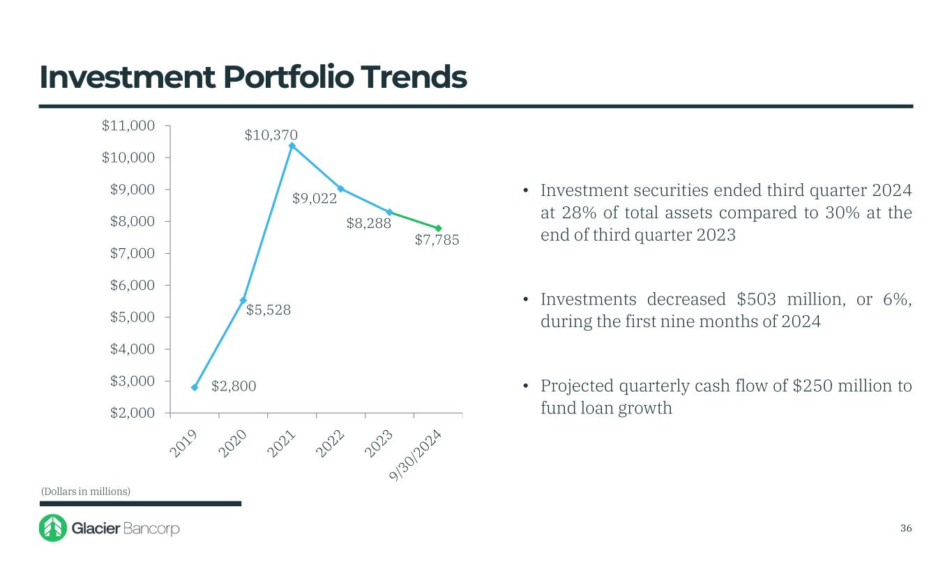 $2,800 $5,528 $10,370 $9,022 $8,288 $7,785 $2,000 $3,000 $4,000 $5,000 $6,000 $7,000 $8,000 $9,000 $10,000 $11,000 • Investment securities ended third quarter 2024 at 28% of total assets compared to 30% at the end of third quarter 2023 • Investments decreased $503 million, or 6%, during the first nine months of 2024 • Projected quarterly cash flow of $250 million to fund loan growth 36 Investment Portfolio Trends (Dollars in millions)