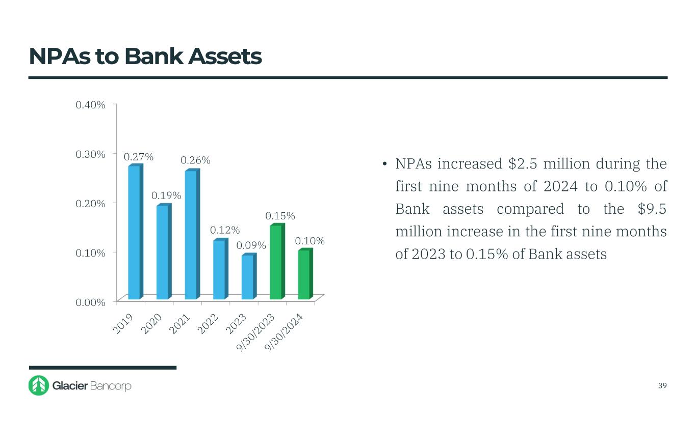 0.00% 0.10% 0.20% 0.30% 0.40% 0.27% 0.19% 0.12% 0.09% 0.15% 0.10% • NPAs increased $2.5 million during the first nine months of 2024 to 0.10% of Bank assets compared to the $9.5 million increase in the first nine months of 2023 to 0.15% of Bank assets 39 NPAs to Bank Assets 0.26%