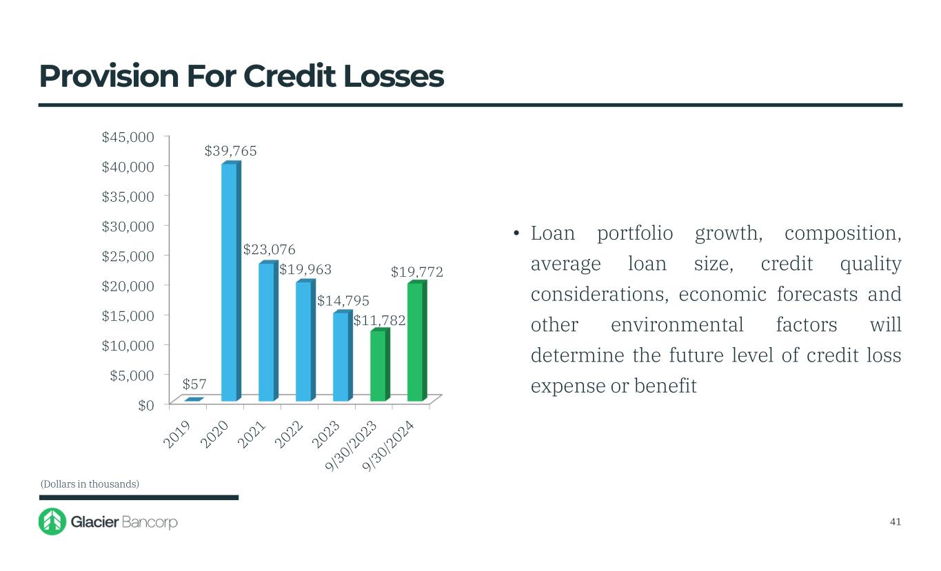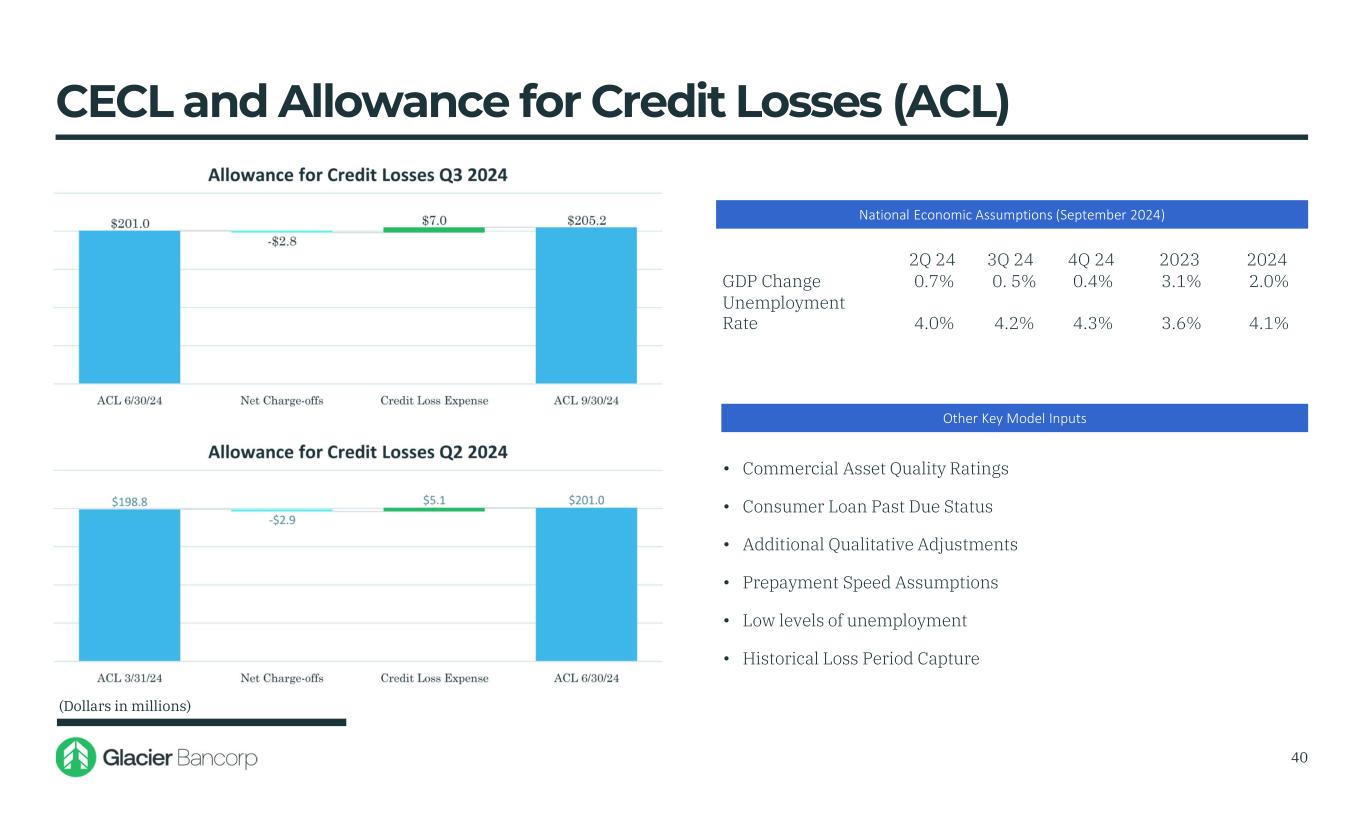 CECL and Allowance for Credit Losses (ACL) • Commercial Asset Quality Ratings • Consumer Loan Past Due Status • Additional Qualitative Adjustments • Prepayment Speed Assumptions • Low levels of unemployment • Historical Loss Period Capture 40 (Dollars in millions) Other Key Model Inputs National Economic Assumptions (September 2024) 2Q 24 3Q 24 4Q 24 2023 2024 GDP Change 0.7% 0. 5% 0.4% 3.1% 2.0% Unemployment Rate 4.0% 4.2% 4.3% 3.6% 4.1% 1.19% of Total Loans 1.19% of Total Loans
