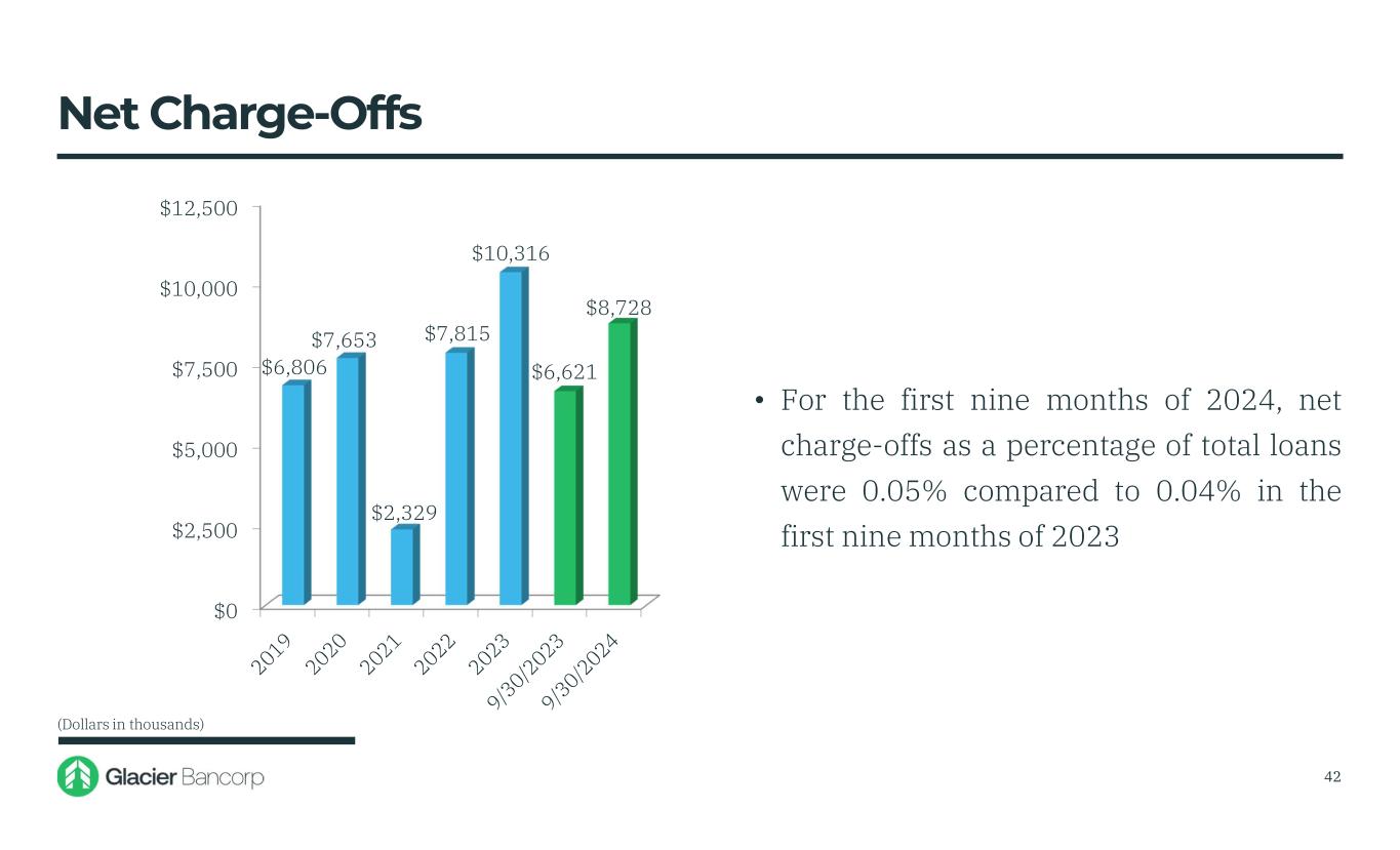 $0 $5,000 $10,000 $15,000 $20,000 $25,000 $30,000 $35,000 $40,000 $45,000 $57 $39,765 $23,076 $19,963 $14,795 $11,782 $19,772 • Loan portfolio growth, composition, average loan size, credit quality considerations, economic forecasts and other environmental factors will determine the future level of credit loss expense or benefit 41 Provision For Credit Losses (Dollars in thousands)
