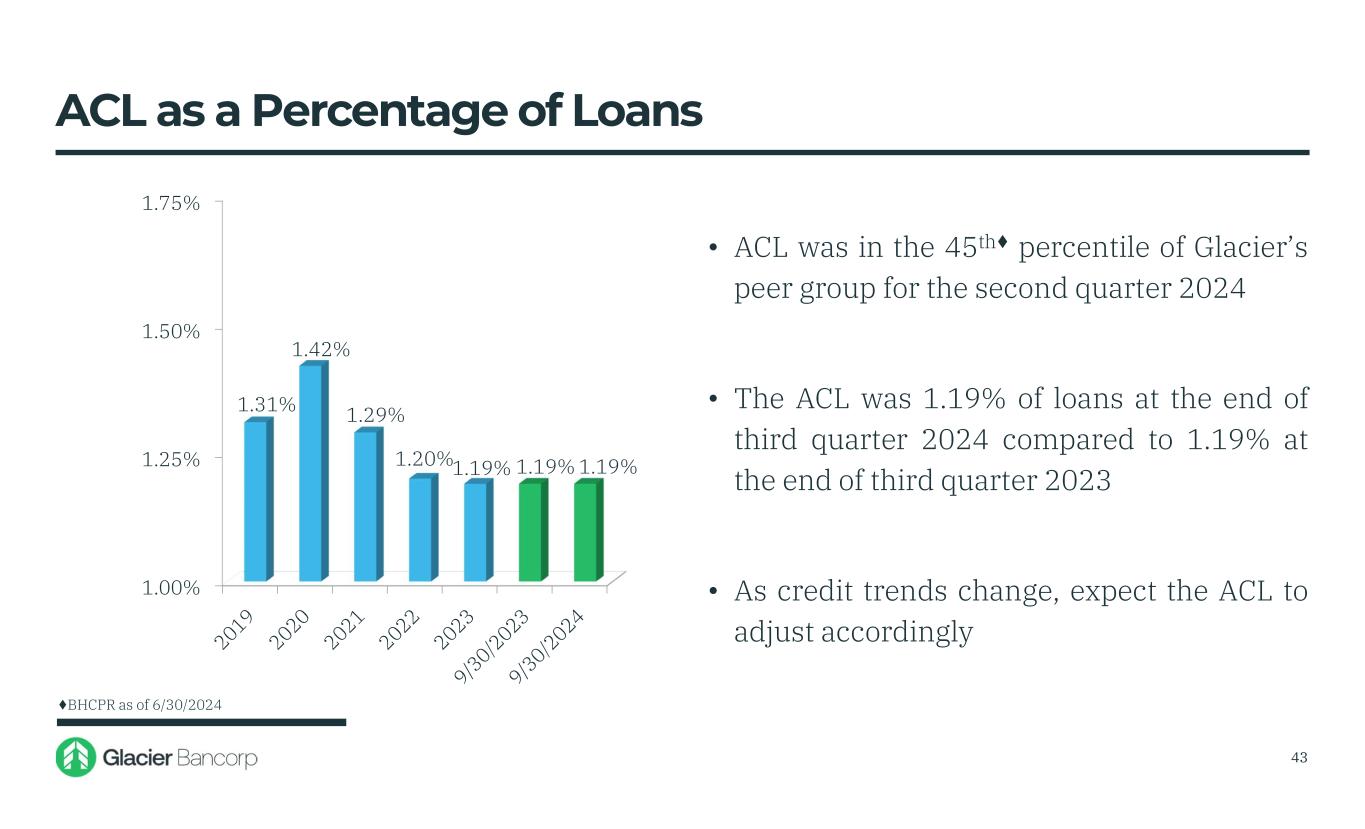 1.00% 1.25% 1.50% 1.75% 1.31% 1.42% 1.29% 1.20%1.19% 1.19% 1.19% • ACL was in the 45th♦ percentile of Glacier’s peer group for the second quarter 2024 • The ACL was 1.19% of loans at the end of third quarter 2024 compared to 1.19% at the end of third quarter 2023 • As credit trends change, expect the ACL to adjust accordingly 43 ACL as a Percentage of Loans ♦BHCPR as of 6/30/2024