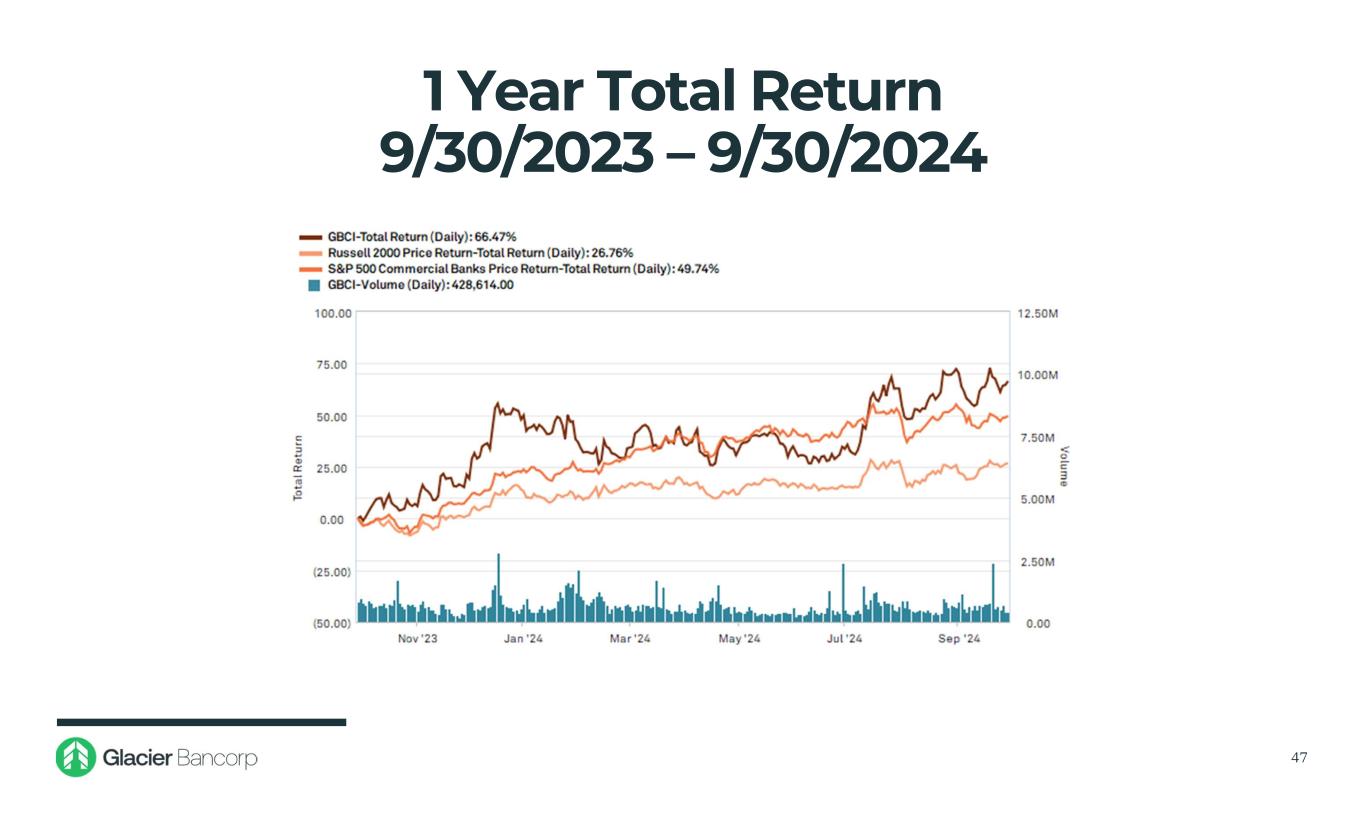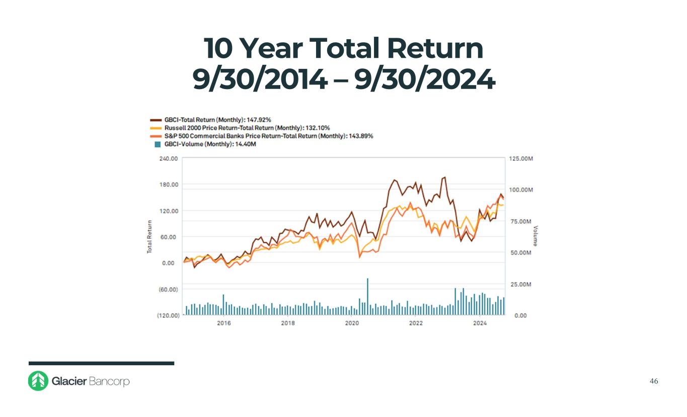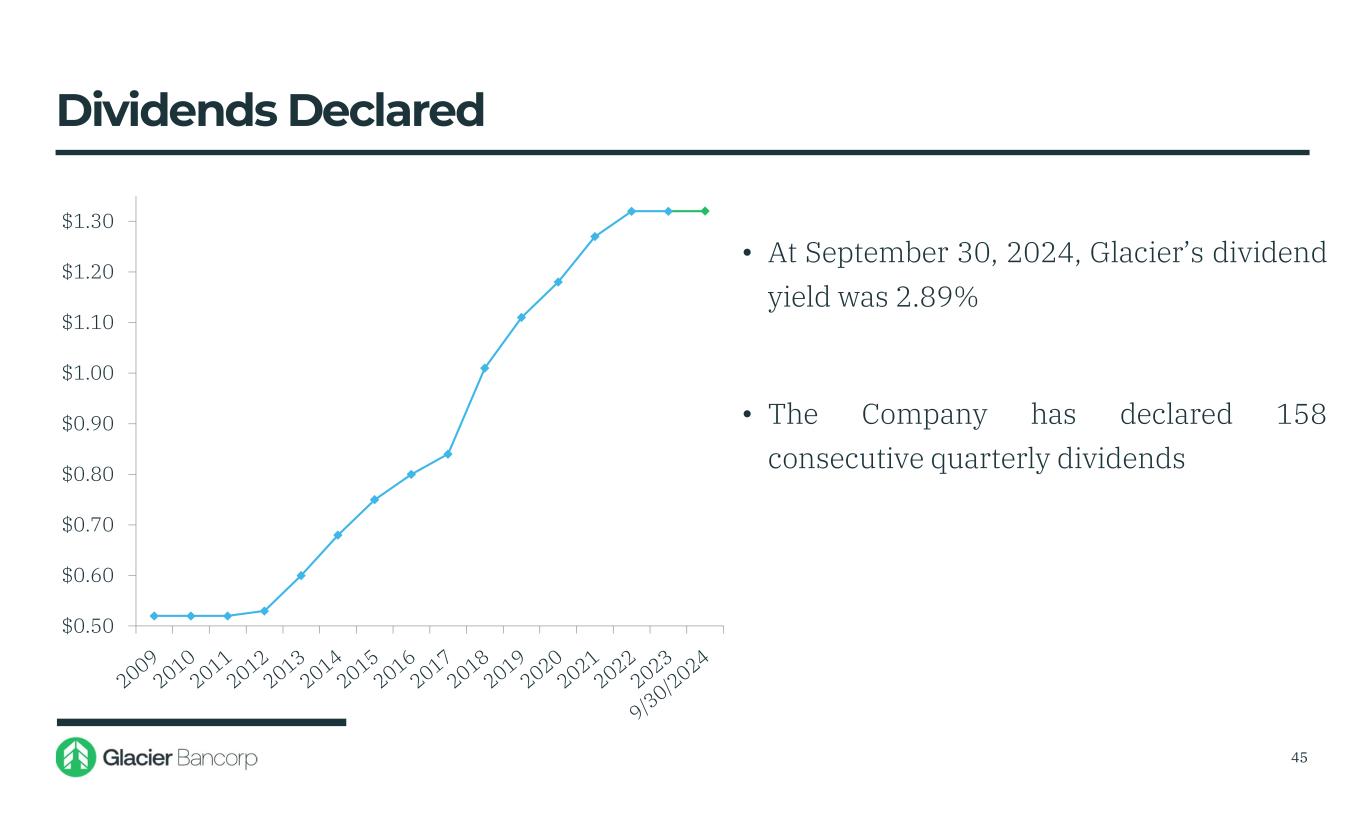 $0.50 $0.60 $0.70 $0.80 $0.90 $1.00 $1.10 $1.20 $1.30 • At September 30, 2024, Glacier’s dividend yield was 2.89% • The Company has declared 158 consecutive quarterly dividends 45 Dividends Declared