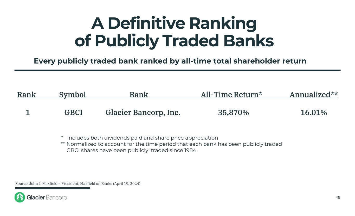 48 A Definitive Ranking of Publicly Traded Banks Every publicly traded bank ranked by all-time total shareholder return * Includes both dividends paid and share price appreciation ** Normalized to account for the time period that each bank has been publicly traded GBCI shares have been publicly traded since 1984 Source: John J. Maxfield – President, Maxfield on Banks (April 19, 2024) Rank Symbol Bank All-Time Return* Annualized** 1 GBCI Glacier Bancorp, Inc. 35,870% 16.01%