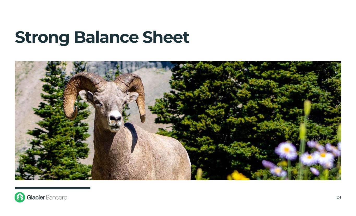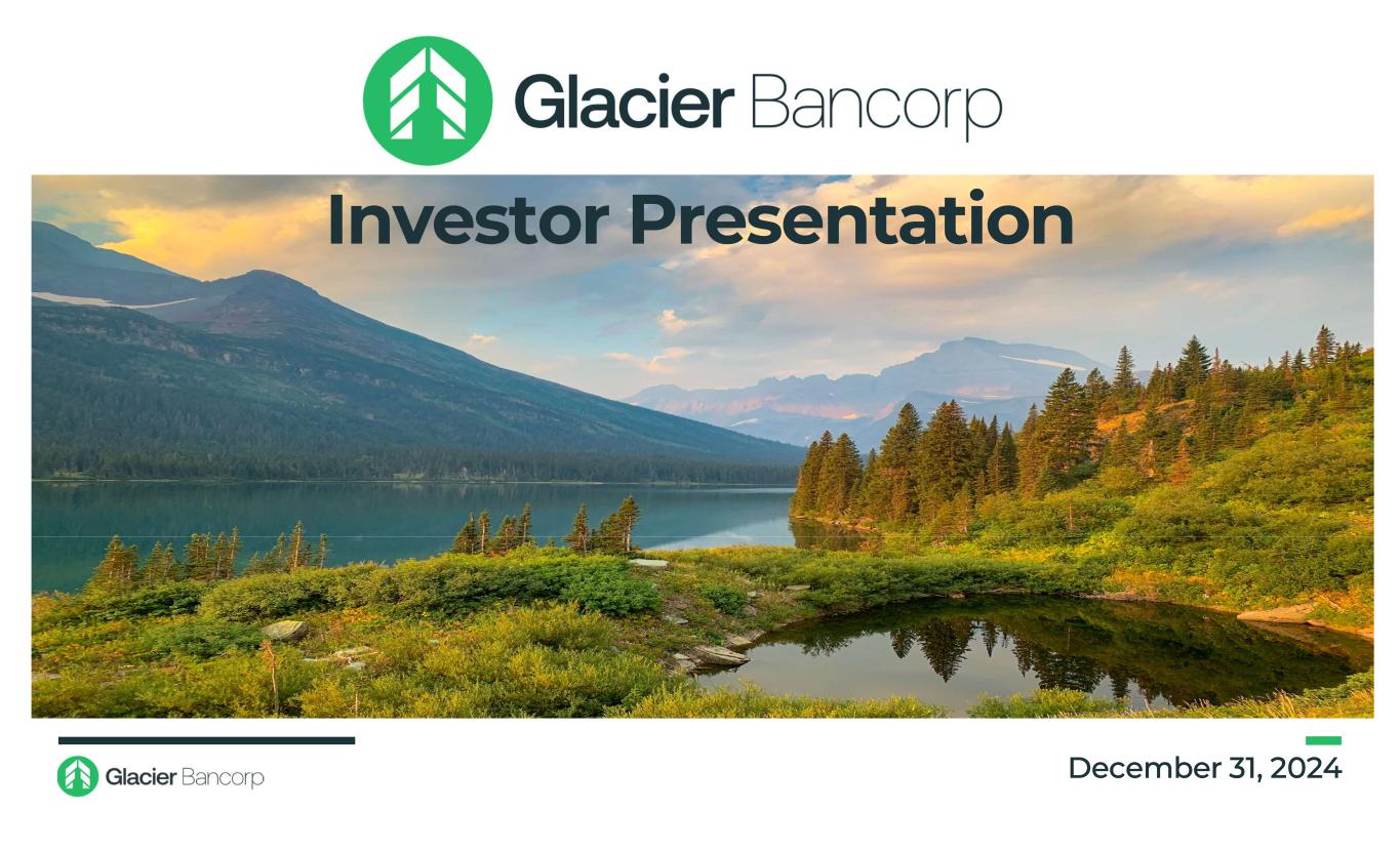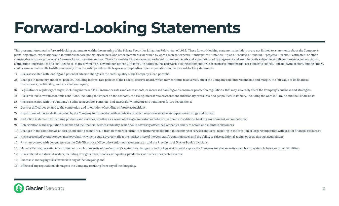 Forward-Looking Statements This presentation contains forward-looking statements within the meaning of the Private Securities Litigation Reform Act of 1995. These forward-looking statements include, but are not limited to, statements about the Company’s plans, objectives, expectations and intentions that are not historical facts, and other statements identified by words such as “expects,” “anticipates,” “intends,” “plans,” “believes,” “should,” “projects,” “seeks,” “estimates” or other comparable words or phrases of a future or forward-looking nature. These forward-looking statements are based on current beliefs and expectations of management and are inherently subject to significant business, economic and competitive uncertainties and contingencies, many of which are beyond the Company’s control. In addition, these forward-looking statements are based on assumptions that are subject to change. The following factors, among others, could cause actual results to differ materially from the anticipated results (express or implied) or other expectations in the forward-looking statements: 1) Risks associated with lending and potential adverse changes in the credit quality of the Company’s loan portfolio; 2) Changes in monetary and fiscal policies, including interest rate policies of the Federal Reserve Board, which may continue to adversely affect the Company’s net interest income and margin, the fair value of its financial instruments, profitability, and stockholders’ equity; 3) Legislative or regulatory changes, including increased FDIC insurance rates and assessments, or increased banking and consumer protection regulations, that may adversely affect the Company’s business and strategies; 4) Risks related to overall economic conditions, including the impact on the economy of a rising interest rate environment, inflationary pressures, and geopolitical instability, including the wars in Ukraine and the Middle East; 5) Risks associated with the Company’s ability to negotiate, complete, and successfully integrate any pending or future acquisitions; 6) Costs or difficulties related to the completion and integration of pending or future acquisitions; 7) Impairment of the goodwill recorded by the Company in connection with acquisitions, which may have an adverse impact on earnings and capital; 8) Reduction in demand for banking products and services, whether as a result of changes in customer behavior, economic conditions, banking environment, or competition; 9) Deterioration of the reputation of banks and the financial services industry, which could adversely affect the Company's ability to obtain and maintain customers; 10) Changes in the competitive landscape, including as may result from new market entrants or further consolidation in the financial services industry, resulting in the creation of larger competitors with greater financial resources; 11) Risks presented by public stock market volatility, which could adversely affect the market price of the Company’s common stock and the ability to raise additional capital or grow through acquisitions; 12) Risks associated with dependence on the Chief Executive Officer, the senior management team and the Presidents of Glacier Bank’s divisions; 13) Material failure, potential interruption or breach in security of the Company’s systems or changes in technology which could expose the Company to cybersecurity risks, fraud, system failures, or direct liabilities; 14) Risks related to natural disasters, including droughts, fires, floods, earthquakes, pandemics, and other unexpected events; 15) Success in managing risks involved in any of the foregoing; and 16) Effects of any reputational damage to the Company resulting from any of the foregoing. 2
