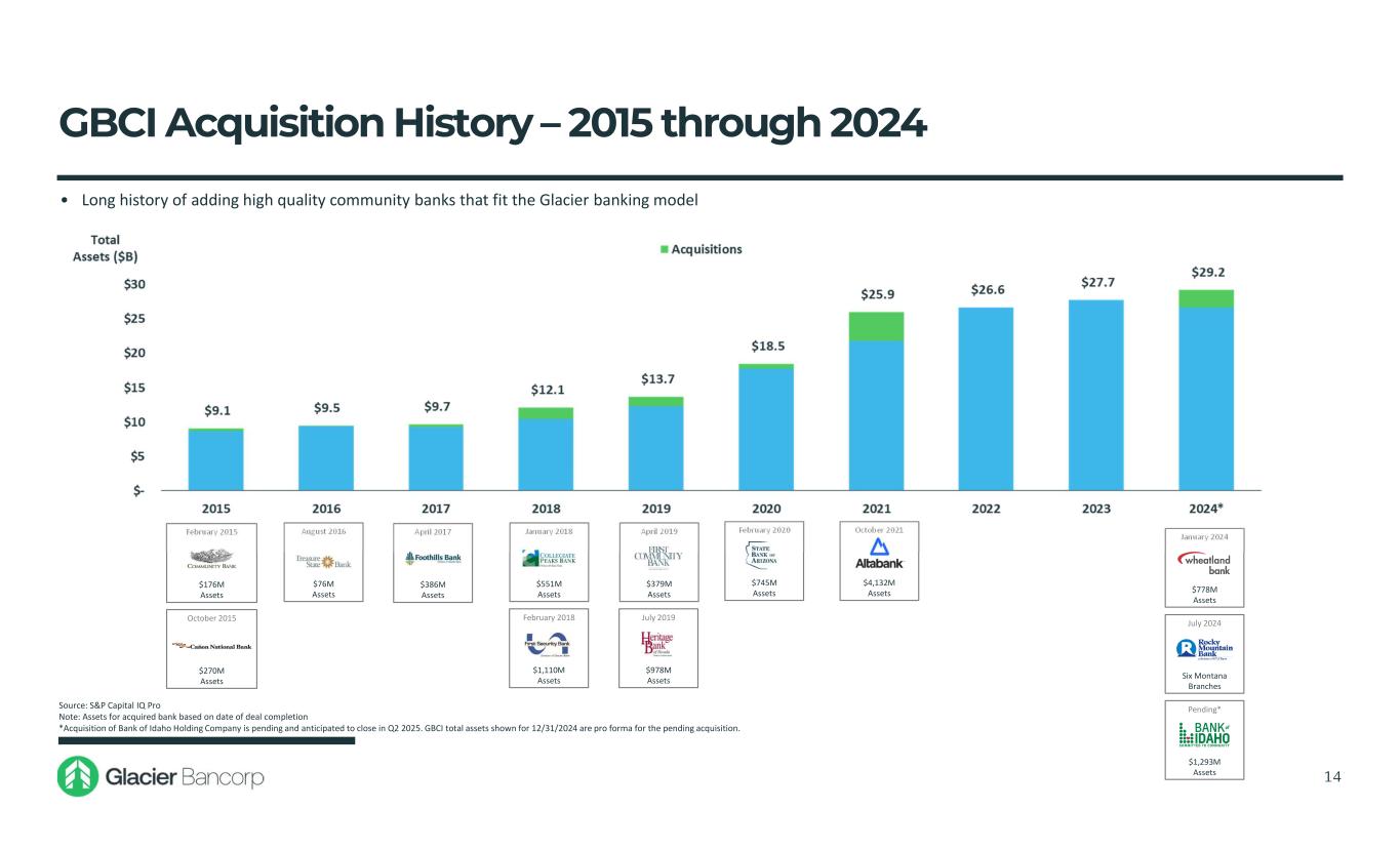 Bank of Idaho Holding Company Transaction Overview and Assumptions 13 Consideration Mix  100% stock consideration to BOID common shareholders  1.100x shares of Glacier stock for each BOID share  BOID options and stock appreciation rights will be cashed out for their in-the-money value Implied Transaction Value(1)  $234.3 million to common shareholders, or $52.47 per share(2)  $11.0 million to option and stock appreciation rights holders(3)  $245.4 million total transaction value Loan Credit Mark Estimate  Gross credit mark discount of $14.2 million, or 1.41% of BOID’s gross loans  95% allocated to non-PCD loans, or $13.5 million  Non-PCD credit mark accreted over 5 years using the sum-of-years’ digits methodology  Establishment of CECL reserve for non-PCD loans of $13.5 million, reflected in pro forma TBV at closing Other Adjustments and Fair Value Estimates  Loan interest rate mark premium of $3.2 million, or 0.32% of BOID’s gross loans, amortized over 5 years using the sum-of-years’ digits methodology  Core deposit intangible of 1.75%, or $15.5 million, amortized over 10 years using the sum-of-years’ digits methodology  Elimination of BOID’s AOCI of $(9.4) million, accreted over 6 years using the sum-of-years’ digits methodology  Fixed asset write-up of $3.3 million; amortized over 20 years straight-line  Net fair value adjustment of $0.4 million for CDs and subordinated debt combined Cost Savings  Cost savings of 30.0% of BOID’s non-interest expense  30.0% realized in 2025, 80.0% realized in 2026 and 100.0% thereafter Durbin Impact  Estimated reduction of BOID’s interchange income by approximately $0.5 million annually, pre-tax Transaction Expenses(4)  Estimated one-time transaction costs of approximately $17.7 million, pre-tax Price Protection  Fixed exchange ratio with collars set between $35.74 and $53.60 (+/- 20% from GBCI stock price in LOI) Minimum Tangible Equity  $122.1 million at closing  Excess tangible common equity, net of any adjustments for BOID’s final transaction expenses, to be paid out to BOID shareholders at closing Expected Closing  Second Quarter of 2025 (1) Based on GBCI closing price of $47.70 on 1/10/2025 (2) Includes 4,420,332 BOID shares and 45,413 RSUs which will vest at closing (3) Includes 370,725 options with a weighted average exercise price of $24.87 and 24,291 SARs with a weighted average grant price of $19.08 (4) Including employment and benefit plan costs, data contract termination and conversion costs and combined professional and advisory fees