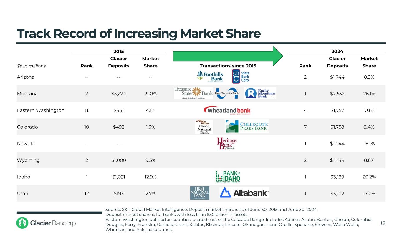 Pending* $1,293M Assets July 2024 Six Montana Branches GBCI Acquisition History – 2015 through 2024 • Long history of adding high quality community banks that fit the Glacier banking model February 2015 $176M Assets October 2015 $270M Assets October 2021 $4,132M Assets July 2019 $978M Assets April 2017 $386M Assets April 2019 $379M Assets February 2018 $1,110M Assets January 2018 $551M Assets February 2020 $745M Assets August 2016 $76M Assets Source: S&P Capital IQ Pro Note: Assets for acquired bank based on date of deal completion *Acquisition of Bank of Idaho Holding Company is pending and anticipated to close in Q2 2025. GBCI total assets shown for 12/31/2024 are pro forma for the pending acquisition. January 2024 $778M Assets 14