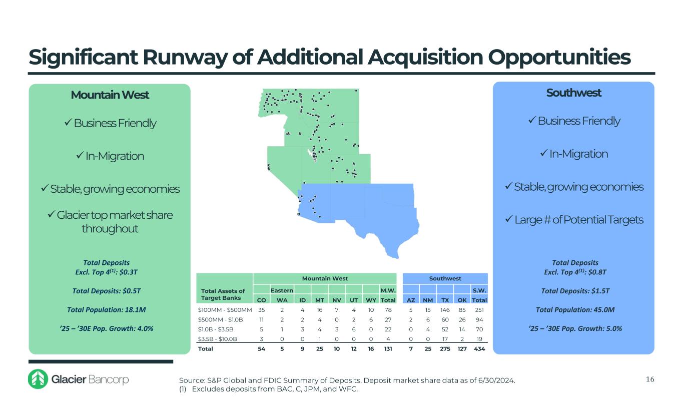 2015 2024 Glacier Market Glacier Market $s in millions Rank Deposits Share Transactions since 2015 Rank Deposits Share Arizona -- -- -- 2 $1,744 8.9% Montana 2 $3,274 21.0% 1 $7,532 26.1% Eastern Washington 8 $451 4.1% 4 $1,757 10.6% Colorado 10 $492 1.3% 7 $1,758 2.4% Nevada -- -- -- 1 $1,044 16.1% Wyoming 2 $1,000 9.5% 2 $1,444 8.6% Idaho 1 $1,021 12.9% 1 $3,189 20.2% Utah 12 $193 2.7% 1 $3,102 17.0% Track Record of Increasing Market Share 15 Source: S&P Global Market Intelligence. Deposit market share is as of June 30, 2015 and June 30, 2024. Deposit market share is for banks with less than $50 billion in assets. Eastern Washington defined as counties located east of the Cascade Range. Includes Adams, Asotin, Benton, Chelan, Columbia, Douglas, Ferry, Franklin, Garfield, Grant, Kittitas, Klickitat, Lincoln, Okanogan, Pend Oreille, Spokane, Stevens, Walla Walla, Whitman, and Yakima counties.