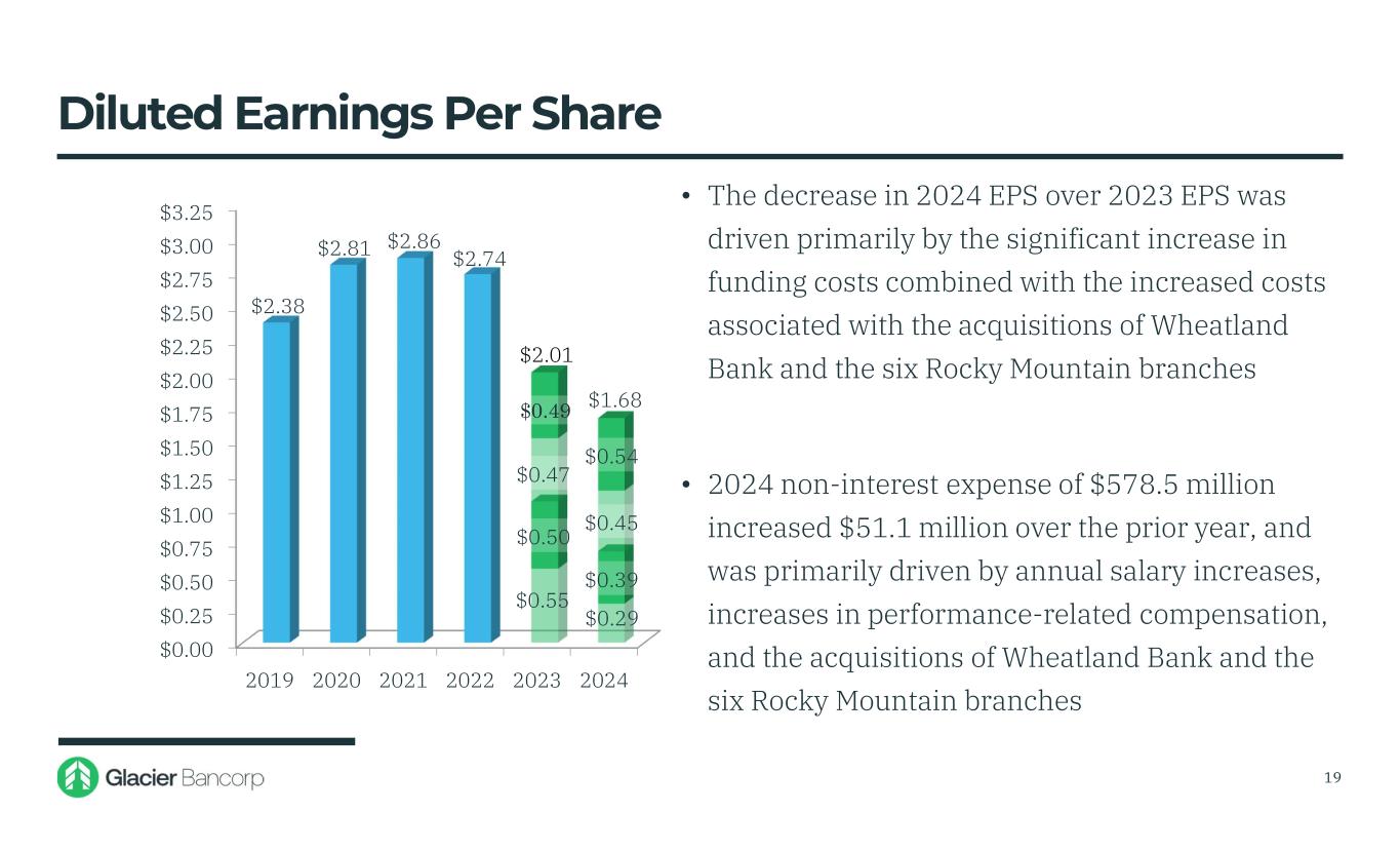 Diluted Earnings Per Share $0.00 $0.25 $0.50 $0.75 $1.00 $1.25 $1.50 $1.75 $2.00 $2.25 $2.50 $2.75 $3.00 $3.25 2019 2020 2021 2022 2023 2024 $2.38 $2.81 $0.55 $0.29 $0.50 $0.39 $0.47 $0.45 $0.49 $0.54 $2.74 $2.01 • The decrease in 2024 EPS over 2023 EPS was driven primarily by the significant increase in funding costs combined with the increased costs associated with the acquisitions of Wheatland Bank and the six Rocky Mountain branches • 2024 non-interest expense of $578.5 million increased $51.1 million over the prior year, and was primarily driven by annual salary increases, increases in performance-related compensation, and the acquisitions of Wheatland Bank and the six Rocky Mountain branches $2.86 $1.68 19