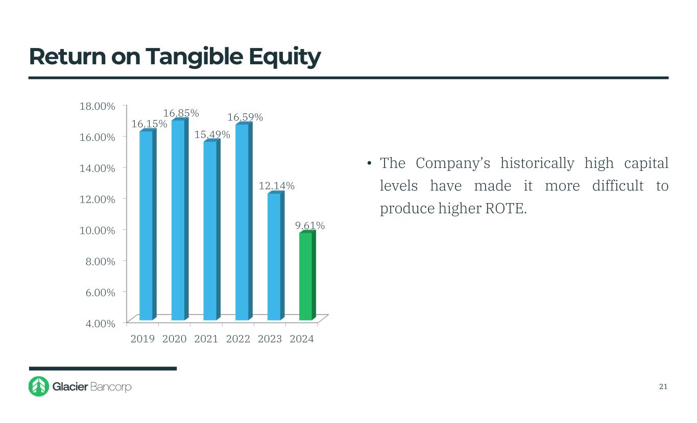 0.20% 0.40% 0.60% 0.80% 1.00% 1.20% 1.40% 1.60% 1.80% 2019 2020 2021 2022 2023 2024 1.62%1.64% 1.33% 0.81% 0.68% • ROA for 2024 was 0.68% • ROA of 0.62% for the third quarter of 2024 was in the 24th♦ percentile among Glacier’s peer group Return on Assets ♦BHCPR as of 9/30/2024 1.15% 20