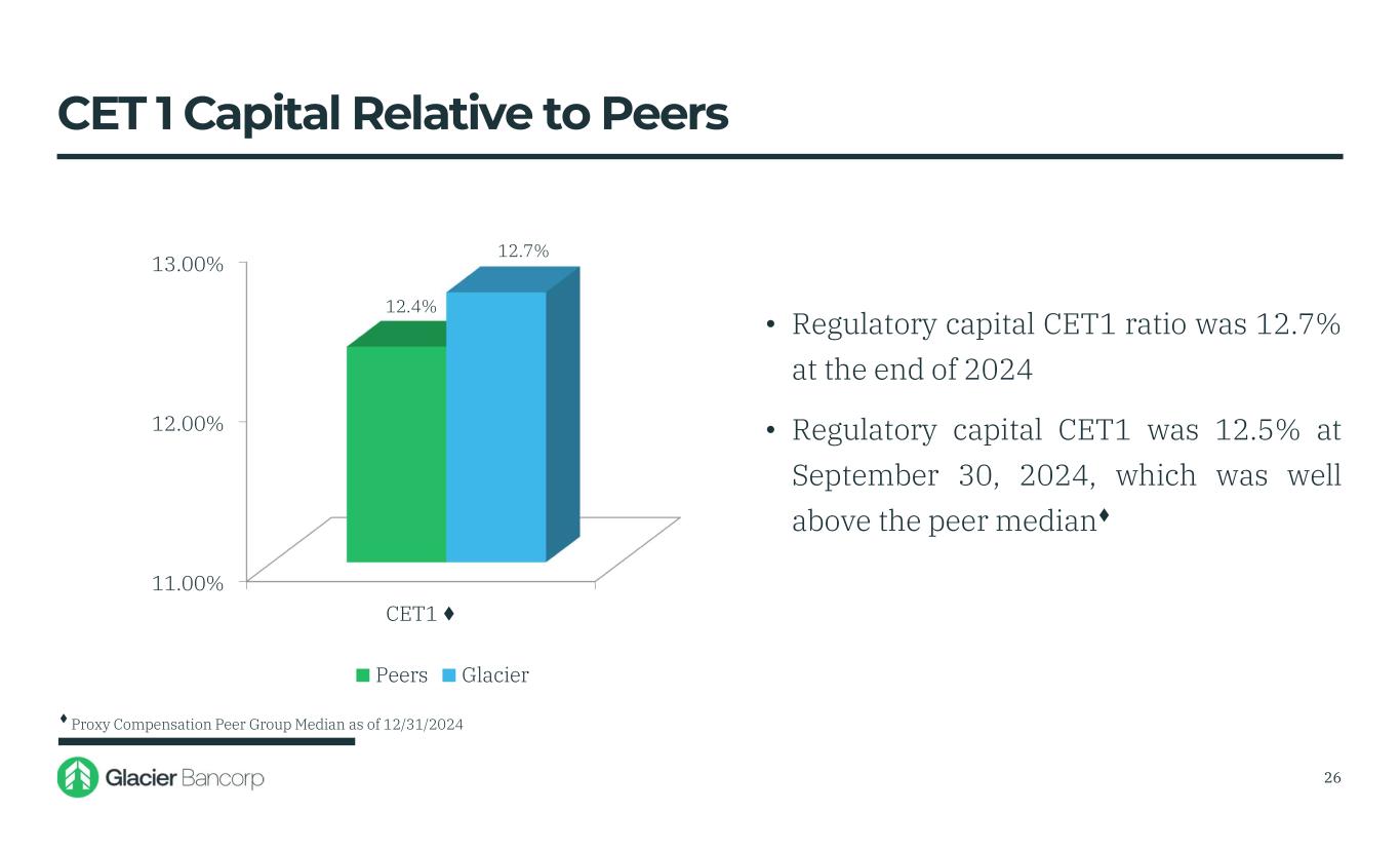 11.00% 12.00% 13.00% CET1 ♦ 12.4% 12.7% Peers Glacier • Regulatory capital CET1 ratio was 12.7% at the end of 2024 • Regulatory capital CET1 was 12.5% at September 30, 2024, which was well above the peer median♦ CET 1 Capital Relative to Peers ♦ Proxy Compensation Peer Group Median as of 12/31/2024 26