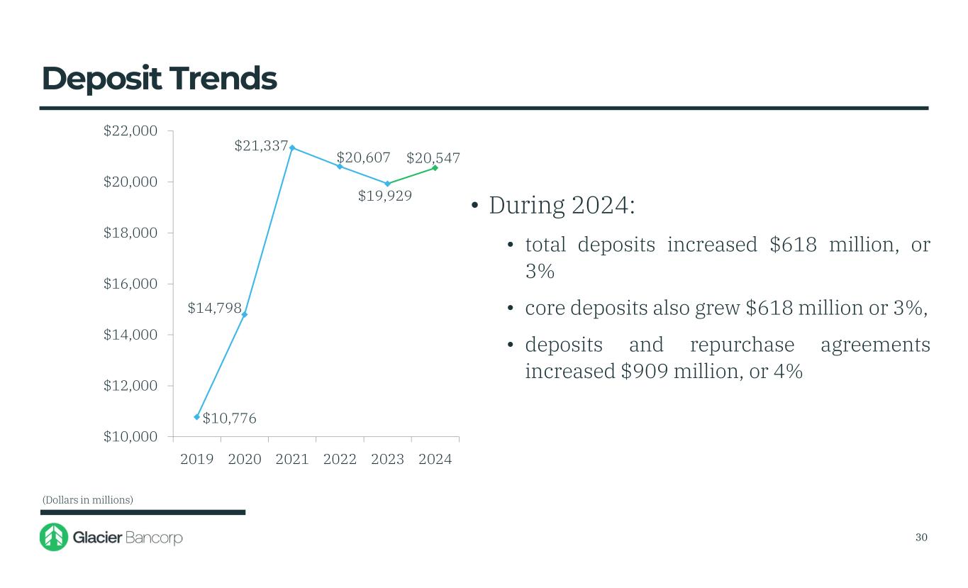 $10,776 $14,798 $21,337 $20,607 $19,929 $20,547 $10,000 $12,000 $14,000 $16,000 $18,000 $20,000 $22,000 2019 2020 2021 2022 2023 2024 • During 2024: • total deposits increased $618 million, or 3% • core deposits also grew $618 million or 3%, • deposits and repurchase agreements increased $909 million, or 4% Deposit Trends (Dollars in millions) 30