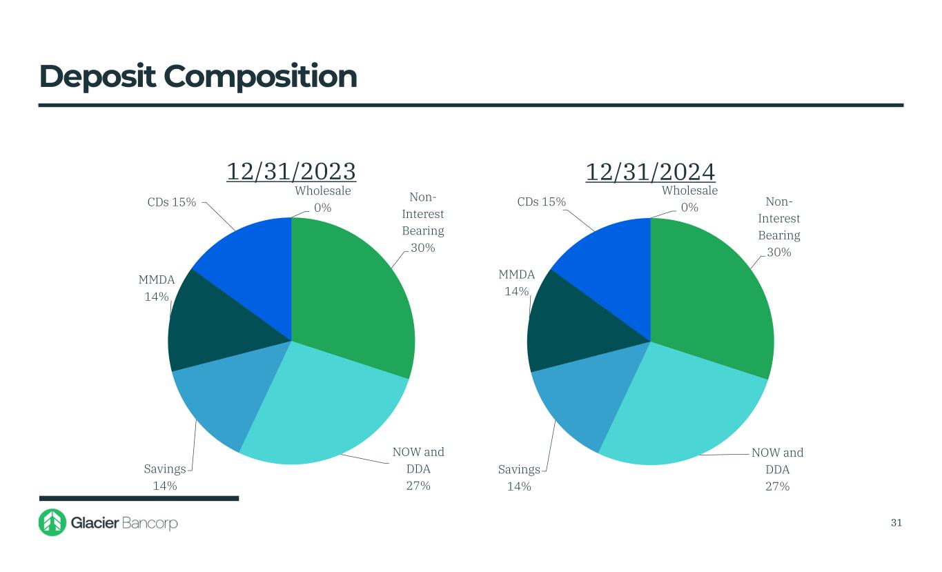 Non- Interest Bearing 30% NOW and DDA 27% Savings 14% MMDA 14% CDs 15% Wholesale 0% 12/31/2023 Non- Interest Bearing 30% NOW and DDA 27% Savings 14% MMDA 14% CDs 15% Wholesale 0% 12/31/2024 Deposit Composition 31