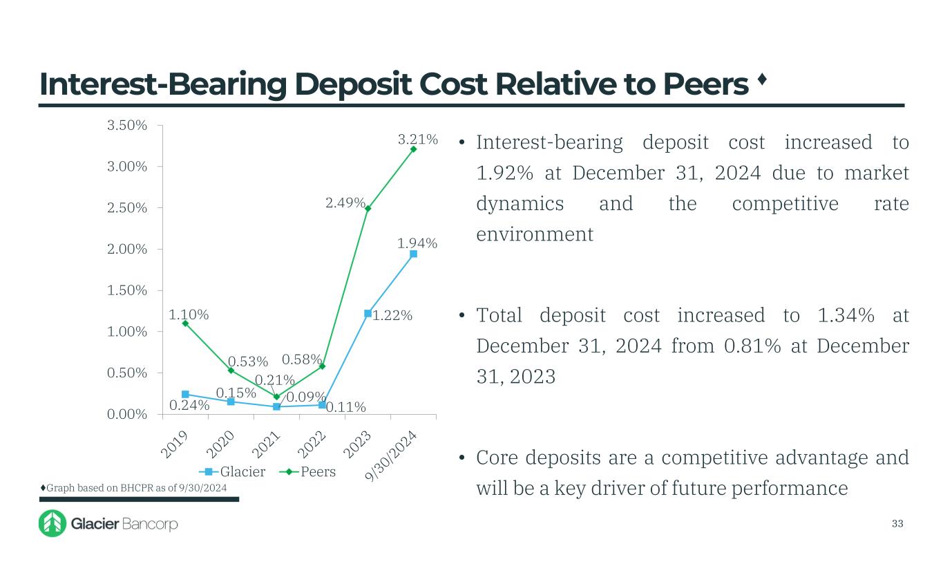 0.24% 0.15% 0.09% 0.11% 1.22% 1.94% 1.10% 0.53% 0.21% 0.58% 2.49% 3.21% 0.00% 0.50% 1.00% 1.50% 2.00% 2.50% 3.00% 3.50% Glacier Peers • Interest-bearing deposit cost increased to 1.92% at December 31, 2024 due to market dynamics and the competitive rate environment • Total deposit cost increased to 1.34% at December 31, 2024 from 0.81% at December 31, 2023 • Core deposits are a competitive advantage and will be a key driver of future performance Interest-Bearing Deposit Cost Relative to Peers ♦ ♦Graph based on BHCPR as of 9/30/2024 33