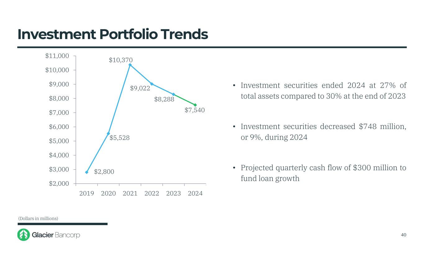$2,800 $5,528 $10,370 $9,022 $8,288 $7,540 $2,000 $3,000 $4,000 $5,000 $6,000 $7,000 $8,000 $9,000 $10,000 $11,000 2019 2020 2021 2022 2023 2024 • Investment securities ended 2024 at 27% of total assets compared to 30% at the end of 2023 • Investment securities decreased $748 million, or 9%, during 2024 • Projected quarterly cash flow of $300 million to fund loan growth Investment Portfolio Trends (Dollars in millions) 40