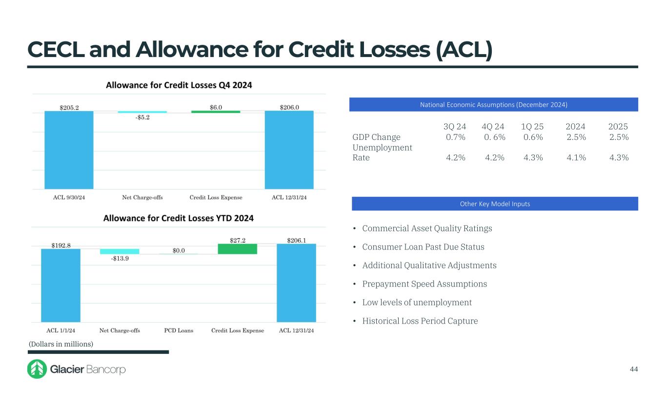 CECL and Allowance for Credit Losses (ACL) • Commercial Asset Quality Ratings • Consumer Loan Past Due Status • Additional Qualitative Adjustments • Prepayment Speed Assumptions • Low levels of unemployment • Historical Loss Period Capture (Dollars in millions) Other Key Model Inputs National Economic Assumptions (December 2024) 3Q 24 4Q 24 1Q 25 2024 2025 GDP Change 0.7% 0. 6% 0.6% 2.5% 2.5% Unemployment Rate 4.2% 4.2% 4.3% 4.1% 4.3% 1.19% of Total Loans 1.19% of Total Loans 44