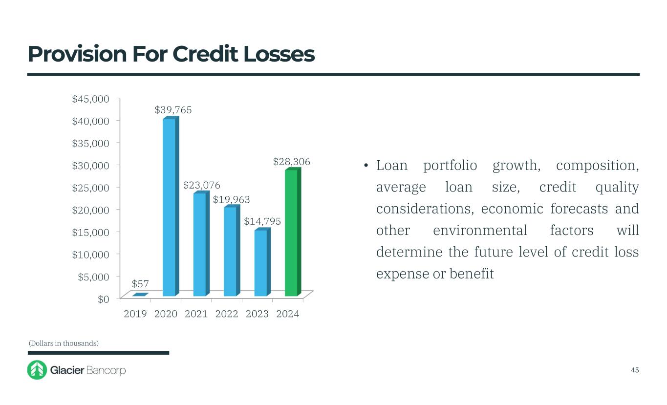 $0 $5,000 $10,000 $15,000 $20,000 $25,000 $30,000 $35,000 $40,000 $45,000 2019 2020 2021 2022 2023 2024 $57 $39,765 $23,076 $19,963 $14,795 $28,306 • Loan portfolio growth, composition, average loan size, credit quality considerations, economic forecasts and other environmental factors will determine the future level of credit loss expense or benefit Provision For Credit Losses (Dollars in thousands) 45