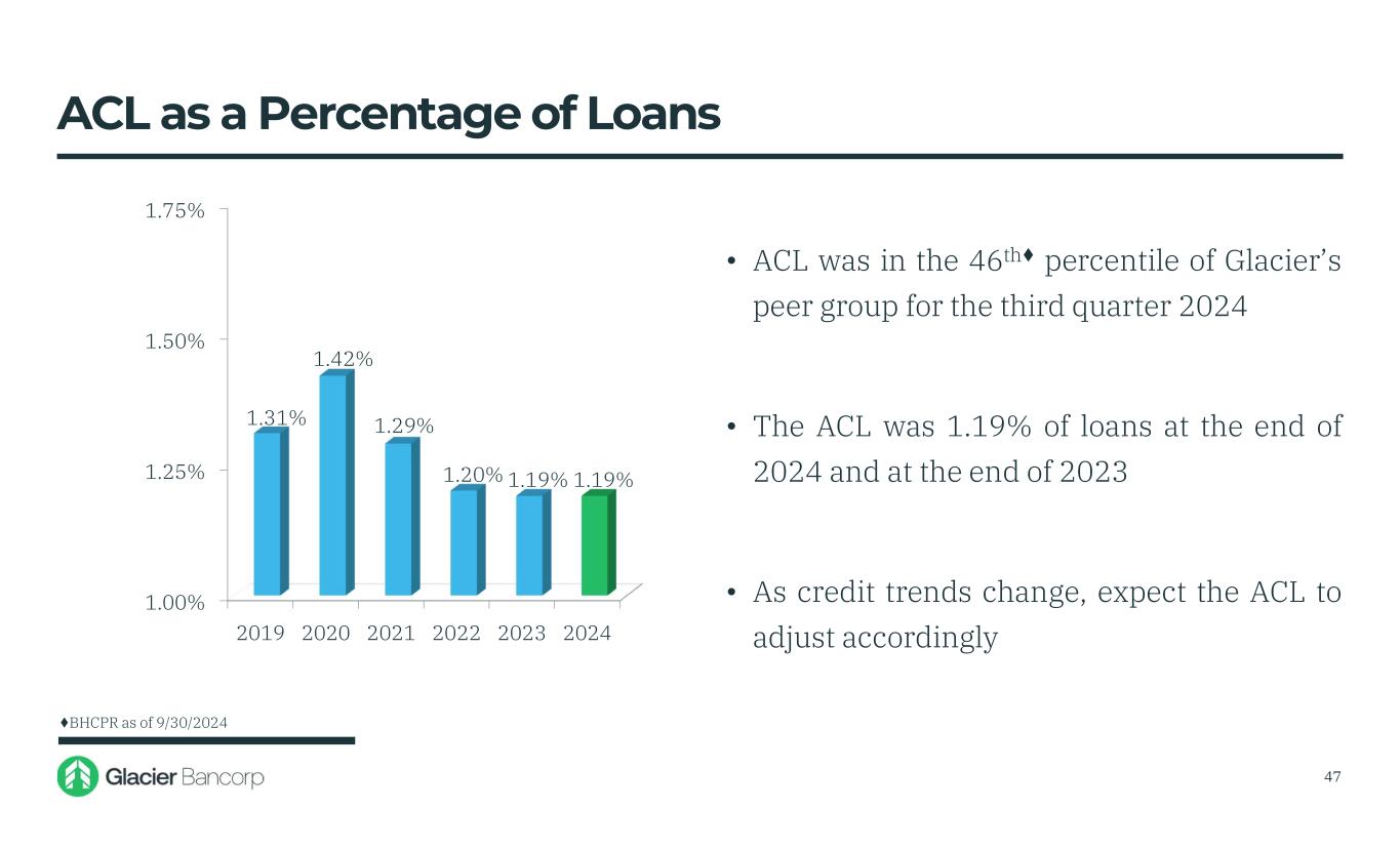 1.00% 1.25% 1.50% 1.75% 2019 2020 2021 2022 2023 2024 1.31% 1.42% 1.29% 1.20% 1.19% 1.19% • ACL was in the 46th♦ percentile of Glacier’s peer group for the third quarter 2024 • The ACL was 1.19% of loans at the end of 2024 and at the end of 2023 • As credit trends change, expect the ACL to adjust accordingly ACL as a Percentage of Loans ♦BHCPR as of 9/30/2024 47