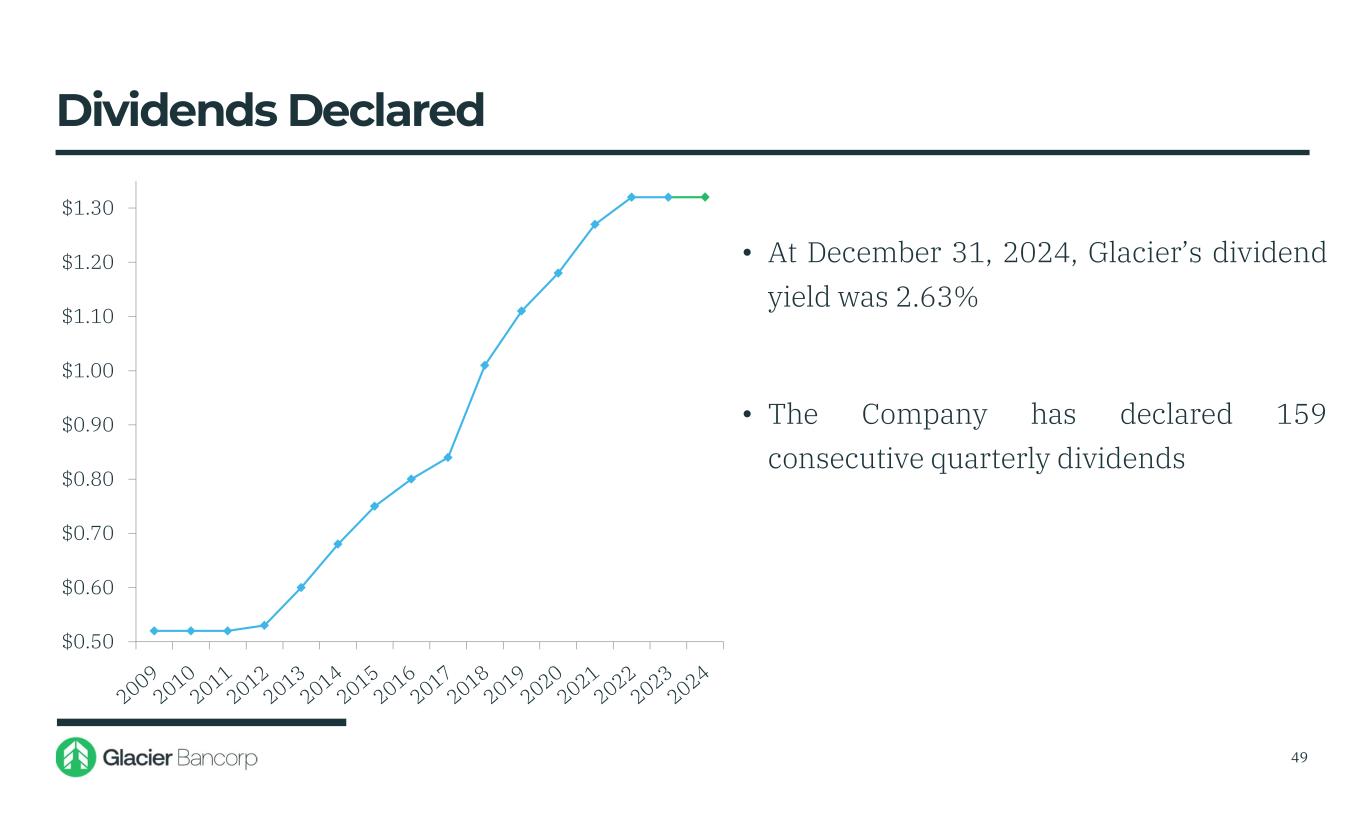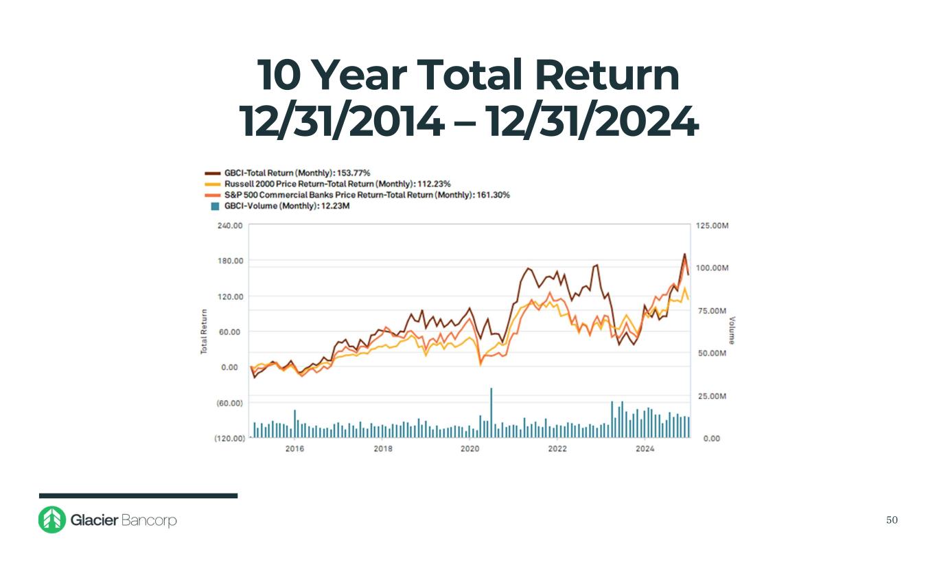 $0.50 $0.60 $0.70 $0.80 $0.90 $1.00 $1.10 $1.20 $1.30 • At December 31, 2024, Glacier’s dividend yield was 2.63% • The Company has declared 159 consecutive quarterly dividends Dividends Declared 49