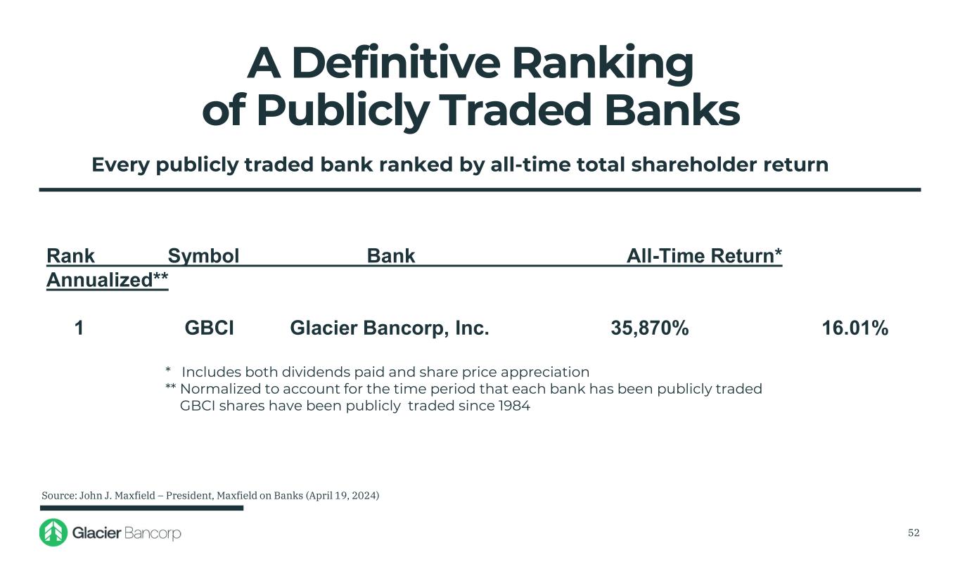 A Definitive Ranking of Publicly Traded Banks Every publicly traded bank ranked by all-time total shareholder return * Includes both dividends paid and share price appreciation ** Normalized to account for the time period that each bank has been publicly traded GBCI shares have been publicly traded since 1984 Source: John J. Maxfield – President, Maxfield on Banks (April 19, 2024) Rank Symbol Bank All-Time Return* Annualized** 1 GBCI Glacier Bancorp, Inc. 35,870% 16.01% 52