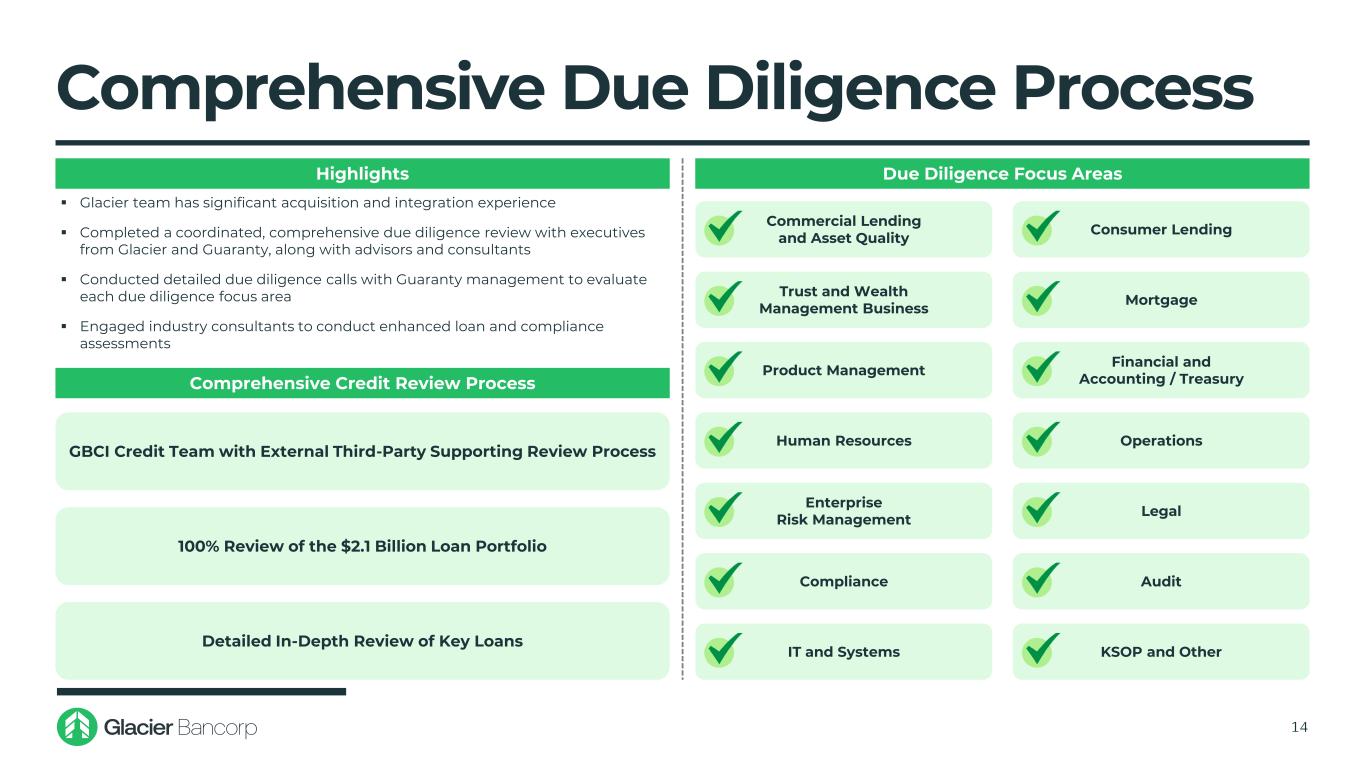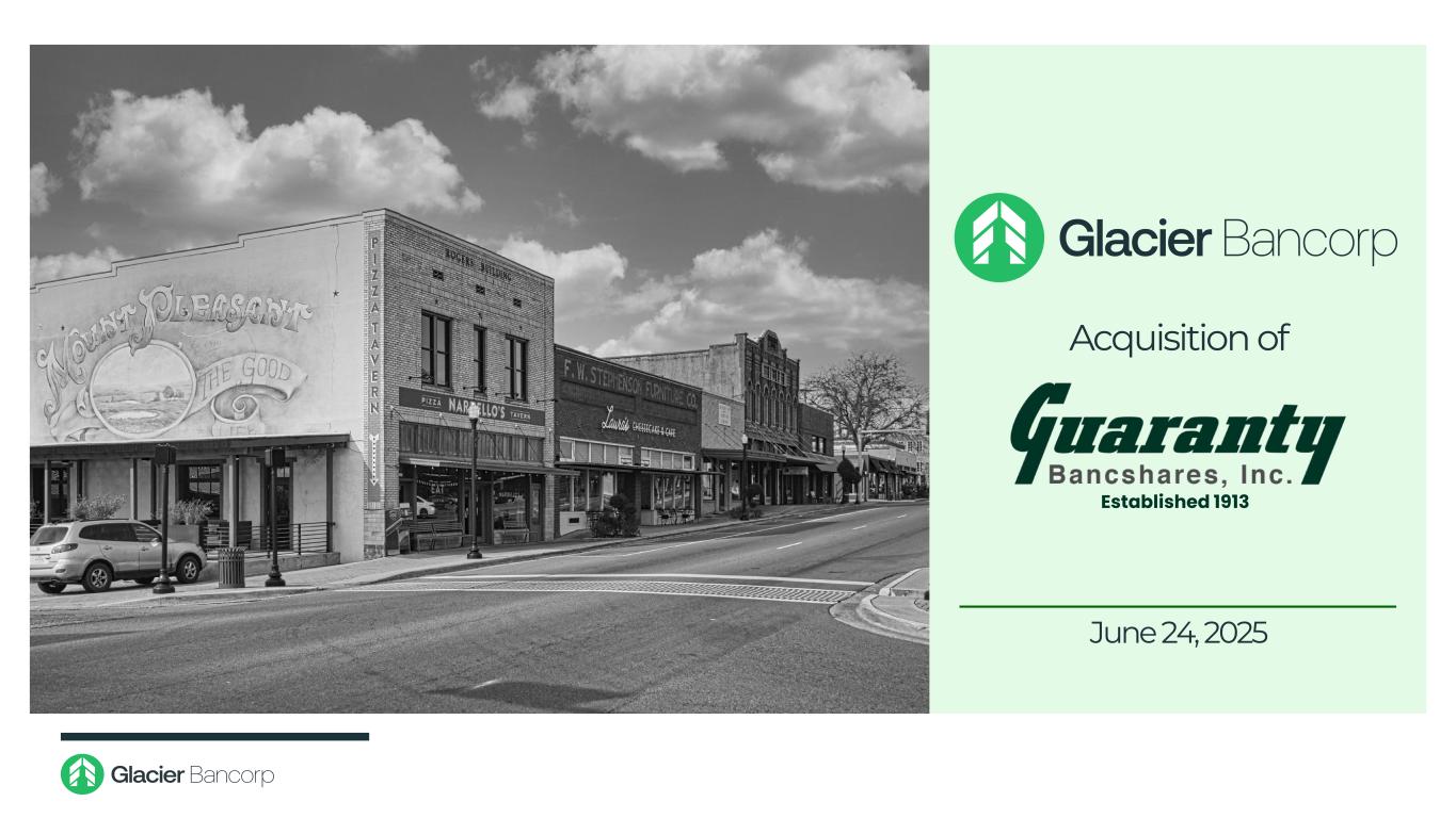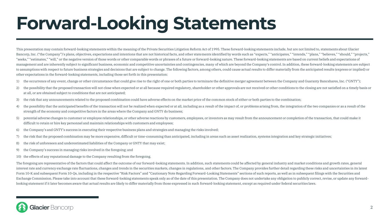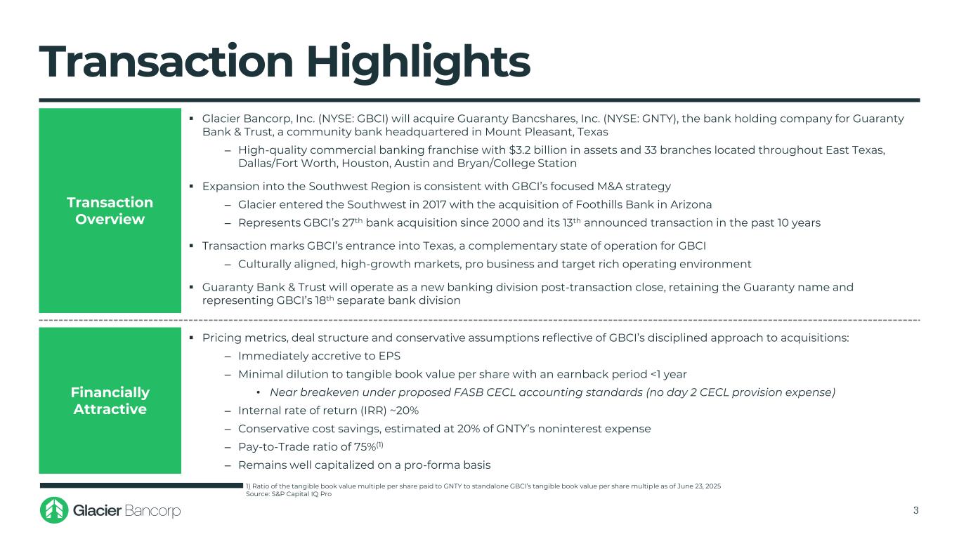 Forward-Looking Statements This presentation may contain forward-looking statements within the meaning of the Private Securities Litigation Reform Act of 1995. These forward-looking statements include, but are not limited to, statements about Glacier Bancorp, Inc. (“the Company”)’s plans, objectives, expectations and intentions that are not historical facts, and other statements identified by words such as “expects,” “anticipates,” “intends,” “plans,” “believes,” “should,” “projects,” “seeks,” “estimates,” “will,” or the negative version of those words or other comparable words or phrases of a future or forward-looking nature. These forward-looking statements are based on current beliefs and expectations of management and are inherently subject to significant business, economic and competitive uncertainties and contingencies, many of which are beyond the Company’s control. In addition, these forward-looking statements are subject to assumptions with respect to future business strategies and decisions that are subject to change. The following factors, among others, could cause actual results to differ materially from the anticipated results (express or implied) or other expectations in the forward-looking statements, including those set forth in this presentation: 1) the occurrence of any event, change or other circumstance that could give rise to the right of one or both parties to terminate the definitive merger agreement between the Company and Guaranty Bancshares, Inc. (“GNTY”); 2) the possibility that the proposed transaction will not close when expected or at all because required regulatory, shareholder or other approvals are not received or other conditions to the closing are not satisfied on a timely basis or at all, or are obtained subject to conditions that are not anticipated; 3) the risk that any announcements related to the proposed combination could have adverse effects on the market price of the common stock of either or both parties to the combination; 4) the possibility that the anticipated benefits of the transaction will not be realized when expected or at all, including as a result of the impact of, or problems arising from, the integration of the two companies or as a result of the strength of the economy and competitive factors in the areas where the Company and GNTY do business; 5) potential adverse changes to customer or employee relationships, or other adverse reactions by customers, employees, or investors as may result from the announcement or completion of the transaction, that could make it difficult to retain or hire key personnel and maintain relationships with customers and employees; 6) the Company’s and GNTY’s success in executing their respective business plans and strategies and managing the risks involved; 7) the risk that the proposed combination may be more expensive, difficult or time-consuming than anticipated, including in areas such as asset realization, systems integration and key strategic initiatives; 8) the risk of unforeseen and underestimated liabilities of the Company or GNTY that may exist; 9) the Company’s success in managing risks involved in the foregoing; and 10) the effects of any reputational damage to the Company resulting from the foregoing. The foregoing are representative of the factors that could affect the outcome of our forward-looking statements. In addition, such statements could be affected by general industry and market conditions and growth rates, general interest rate and currency exchange rate fluctuations, changes and trends in the securities markets, changes in regulations, and other factors. The Company provides further detail regarding these risks and uncertainties in its latest Form 10-K and subsequent Form 10-Qs, including in the respective “Risk Factors” and “Cautionary Note Regarding Forward-Looking Statements” sections of such reports, as well as in subsequent filings with the Securities and Exchange Commission. Please take into account that these forward-looking statements speak only as of the date of this presentation. The Company does not undertake any obligation to publicly correct, revise, or update any forward- looking statement if it later becomes aware that actual results are likely to differ materially from those expressed in such forward-looking statement, except as required under federal securities laws. 2