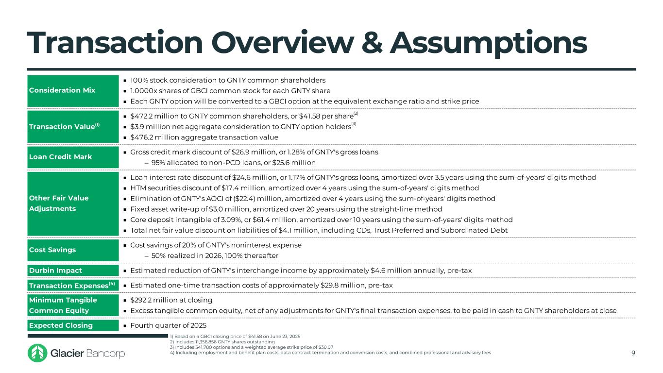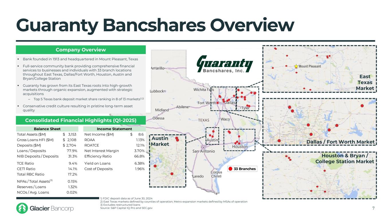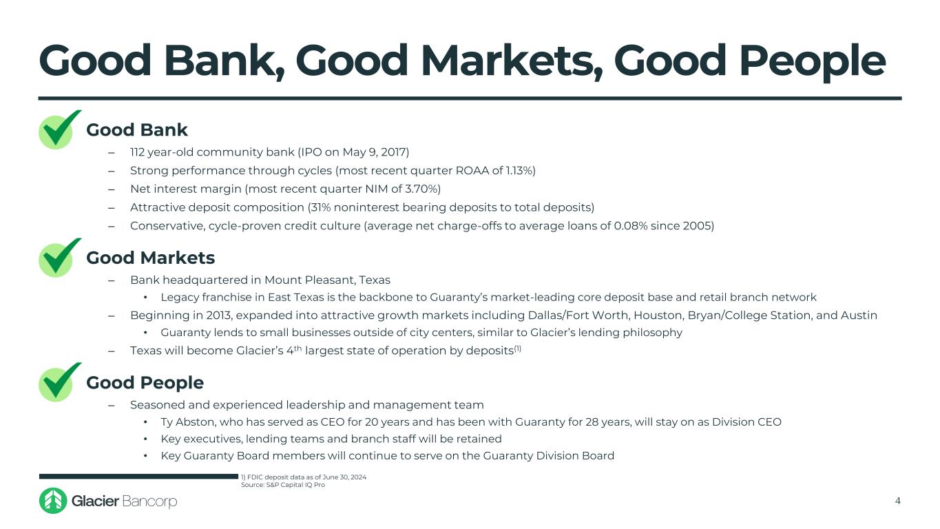 Transaction Highlights 3 Transaction Overview Financially Attractive ▪ Glacier Bancorp, Inc. (NYSE: GBCI) will acquire Guaranty Bancshares, Inc. (NYSE: GNTY), the bank holding company for Guaranty Bank & Trust, a community bank headquartered in Mount Pleasant, Texas ‒ High-quality commercial banking franchise with $3.2 billion in assets and 33 branches located throughout East Texas, Dallas/Fort Worth, Houston, Austin and Bryan/College Station ▪ Expansion into the Southwest Region is consistent with GBCI’s focused M&A strategy ‒ Glacier entered the Southwest in 2017 with the acquisition of Foothills Bank in Arizona ‒ Represents GBCI’s 27th bank acquisition since 2000 and its 13th announced transaction in the past 10 years ▪ Transaction marks GBCI’s entrance into Texas, a complementary state of operation for GBCI ‒ Culturally aligned, high-growth markets, pro business and target rich operating environment ▪ Guaranty Bank & Trust will operate as a new banking division post-transaction close, retaining the Guaranty name and representing GBCI’s 18th separate bank division ▪ Pricing metrics, deal structure and conservative assumptions reflective of GBCI’s disciplined approach to acquisitions: ‒ Immediately accretive to EPS ‒ Minimal dilution to tangible book value per share with an earnback period <1 year • Near breakeven under proposed FASB CECL accounting standards (no day 2 CECL provision expense) ‒ Internal rate of return (IRR) ~20% ‒ Conservative cost savings, estimated at 20% of GNTY’s noninterest expense ‒ Pay-to-Trade ratio of 75%(1) ‒ Remains well capitalized on a pro-forma basis 1) Ratio of the tangible book value multiple per share paid to GNTY to standalone GBCI’s tangible book value per share multip le as of June 23, 2025 Source: S&P Capital IQ Pro