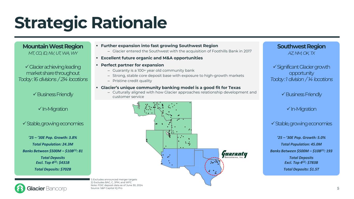Good Bank, Good Markets, Good People 4 Good Bank ‒ 112 year-old community bank (IPO on May 9, 2017) ‒ Strong performance through cycles (most recent quarter ROAA of 1.13%) ‒ Net interest margin (most recent quarter NIM of 3.70%) ‒ Attractive deposit composition (31% noninterest bearing deposits to total deposits) ‒ Conservative, cycle-proven credit culture (average net charge-offs to average loans of 0.08% since 2005) Good Markets ‒ Bank headquartered in Mount Pleasant, Texas • Legacy franchise in East Texas is the backbone to Guaranty’s market-leading core deposit base and retail branch network ‒ Beginning in 2013, expanded into attractive growth markets including Dallas/Fort Worth, Houston, Bryan/College Station, and Austin • Guaranty lends to small businesses outside of city centers, similar to Glacier’s lending philosophy ‒ Texas will become Glacier’s 4th largest state of operation by deposits(1) Good People ‒ Seasoned and experienced leadership and management team • Ty Abston, who has served as CEO for 20 years and has been with Guaranty for 28 years, will stay on as Division CEO • Key executives, lending teams and branch staff will be retained • Key Guaranty Board members will continue to serve on the Guaranty Division Board 1) FDIC deposit data as of June 30, 2024 Source: S&P Capital IQ Pro