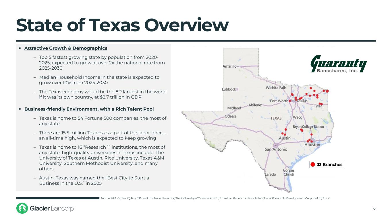 ▪ Further expansion into fast growing Southwest Region ‒ Glacier entered the Southwest with the acquisition of Foothills Bank in 2017 ▪ Excellent future organic and M&A opportunities ▪ Perfect partner for expansion ‒ Guaranty is a 100+ year old community bank ‒ Strong, stable core deposit base with exposure to high-growth markets ‒ Pristine credit quality ▪ Glacier’s unique community banking model is a good fit for Texas ‒ Culturally aligned with how Glacier approaches relationship development and customer service Strategic Rationale 5 1) Excludes announced merger targets 2) Excludes BAC, C, JPM, and WFC Note: FDIC deposit data as of June 30, 2024 Source: S&P Capital IQ Pro Mountain West Region ✓ Business Friendly ✓ In-Migration ✓ Stable, growing economies ✓ Glacier achieving leading market share throughout Today : 16 divisions / 214 locations Southwest Region ✓ Business Friendly ✓ In-Migration ✓ Stable, growing economies ✓ Significant Glacier growth opportunity Today : 1 division / 14 locations ’25 – ’30E Pop. Growth: 5.0% Total Population: 45.0M Banks Between $500M – $10B(1): 193 Total Deposits Excl. Top 4(2): $783B Total Deposits: $1.5T ’25 – ’30E Pop. Growth: 3.8% Total Population: 24.3M Banks Between $500M – $10B(1): 81 Total Deposits Excl. Top 4(2): $431B Total Deposits: $702B MT, CO, ID, NV, UT, WA, WY AZ, NM, OK, TX