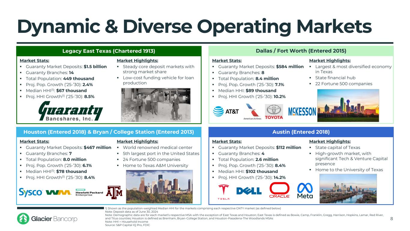 Guaranty Bancshares Overview 7 Balance Sheet Income Statement Total Assets ($M) 3,153$ Net Income ($M) 8.6$ Gross Loans HFI ($M) 2,108$ ROAA 1.13% Deposits ($M) 2,704$ ROATCE 12.1% Loans / Deposits 77.9% Net Interest Margin 3.70% NIB Deposits / Deposits 31.3% Efficiency Ratio 66.8% TCE Ratio 9.4% Yield on Loans 6.38% CET1 Ratio 14.1% Cost of Deposits 1.96% Total RBC Ratio 17.2% NPAs / Total Assets(3) 0.15% Reserves / Loans 1.32% NCOs / Avg. Loans 0.02% Consolidated Financial Highlights (Q1-2025) Company Overview ▪ Bank founded in 1913 and headquartered in Mount Pleasant, Texas ▪ Full-service community bank providing comprehensive financial services to businesses and individuals with 33 branch locations throughout East Texas, Dallas/Fort Worth, Houston, Austin and Bryan/College Station ▪ Guaranty has grown from its East Texas roots into high-growth markets through organic expansion, augmented with strategic acquisitions ‒ Top 5 Texas bank deposit market share ranking in 8 of 13 markets(1,2) ▪ Conservative credit culture resulting in pristine long-term asset quality 1) FDIC deposit data as of June 30, 2024 2) East Texas markets defined by counties of operation; Metro expansion markets defined by MSAs of operation 3) Excludes restructured loans Source: S&P Capital IQ Pro and SEC.gov Dallas / Fort Worth Market Austin Market Houston & Bryan / College Station Market East Texas Market 33 Branches