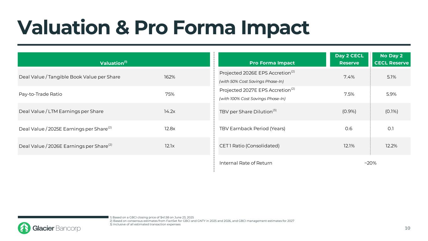 Transaction Overview & Assumptions 9 ▪ 100% stock consideration to GNTY common shareholders ▪ 1.0000x shares of GBCI common stock for each GNTY share ▪ Each GNTY option will be converted to a GBCI option at the equivalent exchange ratio and strike price ▪ $472.2 million to GNTY common shareholders, or $41.58 per share ▪ $3.9 million net aggregate consideration to GNTY option holders ▪ $476.2 million aggregate transaction value ▪ Gross credit mark discount of $26.9 million, or 1.28% of GNTY's gross loans ‒ 95% allocated to non-PCD loans, or $25.6 million ▪ Loan interest rate discount of $24.6 million, or 1.17% of GNTY's gross loans, amortized over 3.5 years using the sum-of-years' digits method ▪ HTM securities discount of $17.4 million, amortized over 4 years using the sum-of-years' digits method ▪ Elimination of GNTY's AOCI of ($22.4) million, amortized over 4 years using the sum-of-years' digits method ▪ Fixed asset write-up of $3.0 million, amortized over 20 years using the straight-line method ▪ Core deposit intangible of 3.09%, or $61.4 million, amortized over 10 years using the sum-of-years' digits method ▪ Total net fair value discount on liabilities of $4.1 million, including CDs, Trust Preferred and Subordinated Debt ▪ Cost savings of 20% of GNTY's noninterest expense ‒ 50% realized in 2026, 100% thereafter Durbin Impact ▪ Estimated reduction of GNTY's interchange income by approximately $4.6 million annually, pre-tax Transaction Expenses(4) ▪ Estimated one-time transaction costs of approximately $29.8 million, pre-tax ▪ $292.2 million at closing ▪ Excess tangible common equity, net of any adjustments for GNTY's final transaction expenses, to be paid in cash to GNTY shareholders at close Expected Closing ▪ Fourth quarter of 2025 Minimum Tangible Common Equity Consideration Mix Transaction Value(1) Loan Credit Mark Other Fair Value Adjustments Cost Savings 1) Based on a GBCI closing price of $41.58 on June 23, 2025 2) Includes 11,356,856 GNTY shares outstanding 3) Includes 341,780 options and a weighted average strike price of $30.07 4) Including employment and benefit plan costs, data contract termination and conversion costs, and combined professional and advisory fees (2) (3)