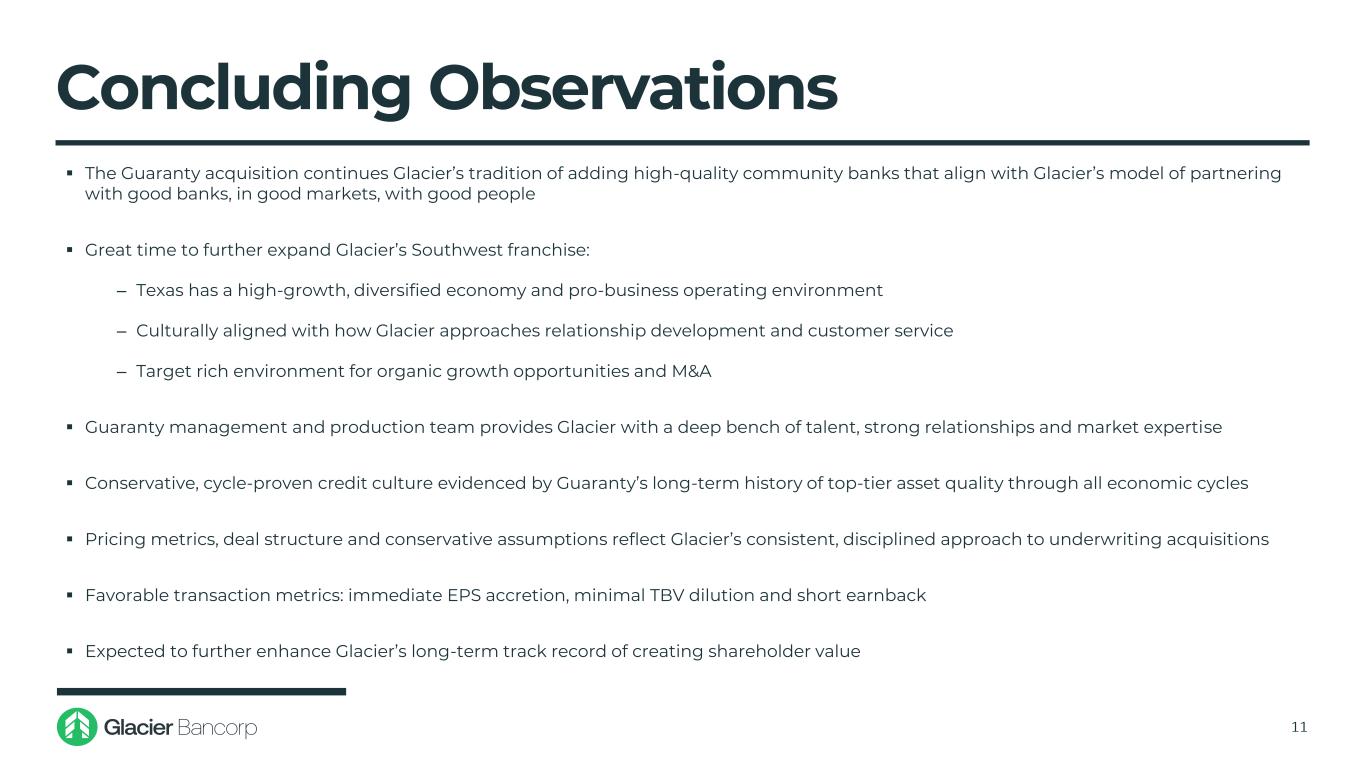 Valuation & Pro Forma Impact 10 Valuation(1) Deal Value / Tangible Book Value per Share Pay-to-Trade Ratio Deal Value / LTM Earnings per Share Deal Value / 2025E Earnings per Share(2) Deal Value / 2026E Earnings per Share(2) 75% 162% 12.1x 12.8x 14.2x Day 2 CECL No Day 2 Pro Forma Impact Reserve CECL Reserve Projected 2026E EPS Accretion(2) (with 50% Cost Savings Phase-In) Projected 2027E EPS Accretion(2) (with 100% Cost Savings Phase-In) 12.1% 12.2% 7.5% 5.9% 5.1%7.4% 0.6 0.1 (0.1%)(0.9%) CET 1 Ratio (Consolidated) ~20%Internal Rate of Return TBV per Share Dilution(3) TBV Earnback Period (Years) 1) Based on a GBCI closing price of $41.58 on June 23, 2025 2) Based on consensus estimates from FactSet for GBCI and GNTY in 2025 and 2026, and GBCI management estimates for 2027 3) Inclusive of all estimated transaction expenses
