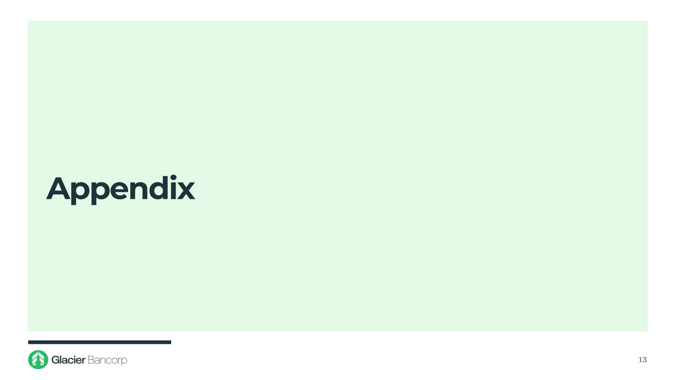 Concluding Observations 11 ▪ The Guaranty acquisition continues Glacier’s tradition of adding high-quality community banks that align with Glacier’s model of partnering with good banks, in good markets, with good people ▪ Great time to further expand Glacier’s Southwest franchise: ‒ Texas has a high-growth, diversified economy and pro-business operating environment ‒ Culturally aligned with how Glacier approaches relationship development and customer service ‒ Target rich environment for organic growth opportunities and M&A ▪ Guaranty management and production team provides Glacier with a deep bench of talent, strong relationships and market expertise ▪ Conservative, cycle-proven credit culture evidenced by Guaranty’s long-term history of top-tier asset quality through all economic cycles ▪ Pricing metrics, deal structure and conservative assumptions reflect Glacier’s consistent, disciplined approach to underwriting acquisitions ▪ Favorable transaction metrics: immediate EPS accretion, minimal TBV dilution and short earnback ▪ Expected to further enhance Glacier’s long-term track record of creating shareholder value