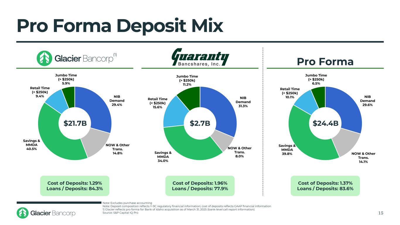 Comprehensive Due Diligence Process 14 Highlights Due Diligence Focus Areas Commercial Lending and Asset Quality Consumer Lending Trust and Wealth Management Business Mortgage Product Management Financial and Accounting / Treasury Human Resources Operations Enterprise Risk Management Legal Compliance Audit IT and Systems KSOP and Other Comprehensive Credit Review Process GBCI Credit Team with External Third-Party Supporting Review Process 100% Review of the $2.1 Billion Loan Portfolio Detailed In-Depth Review of Key Loans ▪ Glacier team has significant acquisition and integration experience ▪ Completed a coordinated, comprehensive due diligence review with executives from Glacier and Guaranty, along with advisors and consultants ▪ Conducted detailed due diligence calls with Guaranty management to evaluate each due diligence focus area ▪ Engaged industry consultants to conduct enhanced loan and compliance assessments