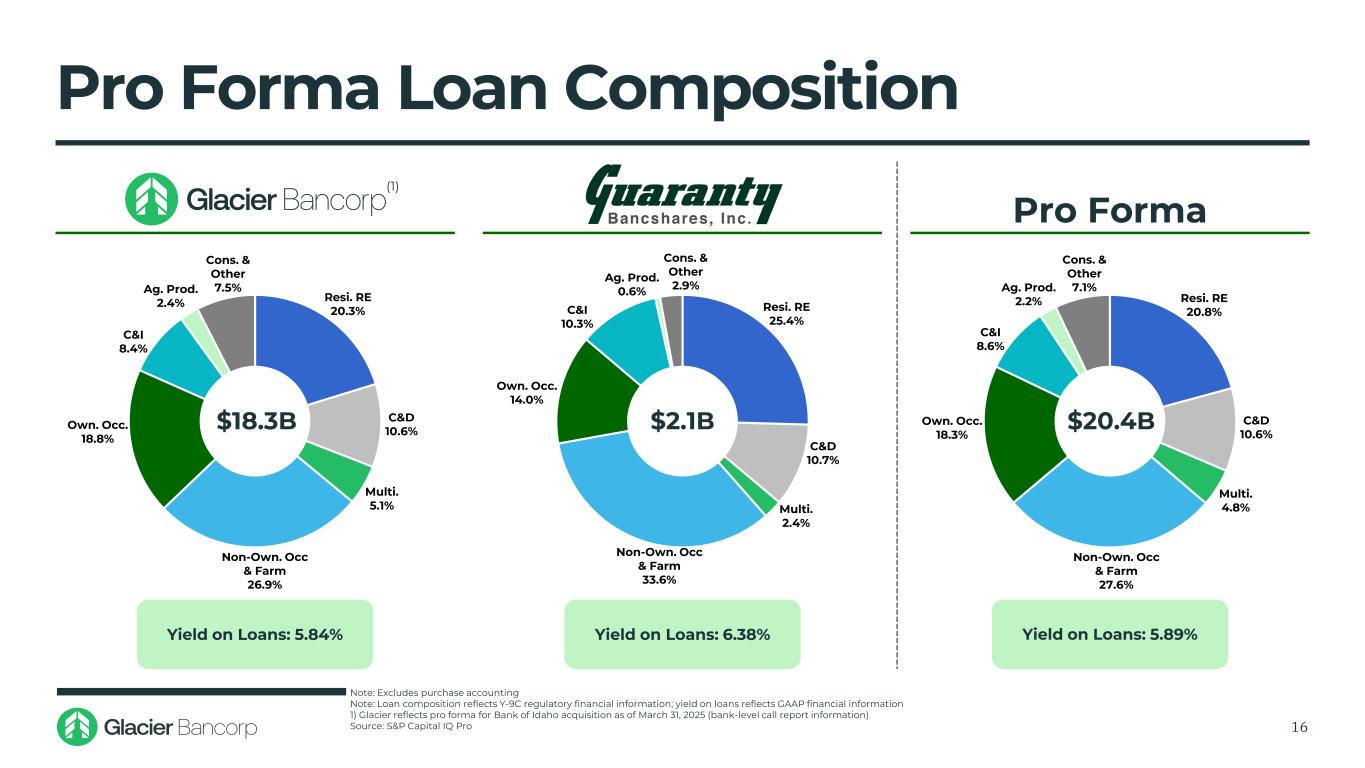 NIB Demand 29.4% NOW & Other Trans. 14.8% Savings & MMDA 40.5% Retail Time (< $250k) 9.4% Jumbo Time (> $250k) 5.9% NIB Demand 31.3% NOW & Other Trans. 8.0% Savings & MMDA 34.0% Retail Time (< $250k) 15.6% Jumbo Time (> $250k) 11.2% NIB Demand 29.6% NOW & Other Trans. 14.1% Savings & MMDA 39.8% Retail Time (< $250k) 10.1% Jumbo Time (> $250k) 6.5% Pro Forma Deposit Mix 15 Pro Forma Cost of Deposits: 1.29% Loans / Deposits: 84.3% Cost of Deposits: 1.96% Loans / Deposits: 77.9% Cost of Deposits: 1.37% Loans / Deposits: 83.6% $21.7B $2.7B $24.4B Note: Excludes purchase accounting Note: Deposit composition reflects Y-9C regulatory financial information; cost of deposits reflects GAAP financial information 1) Glacier reflects pro forma for Bank of Idaho acquisition as of March 31, 2025 (bank-level call report information) Source: S&P Capital IQ Pro (1)