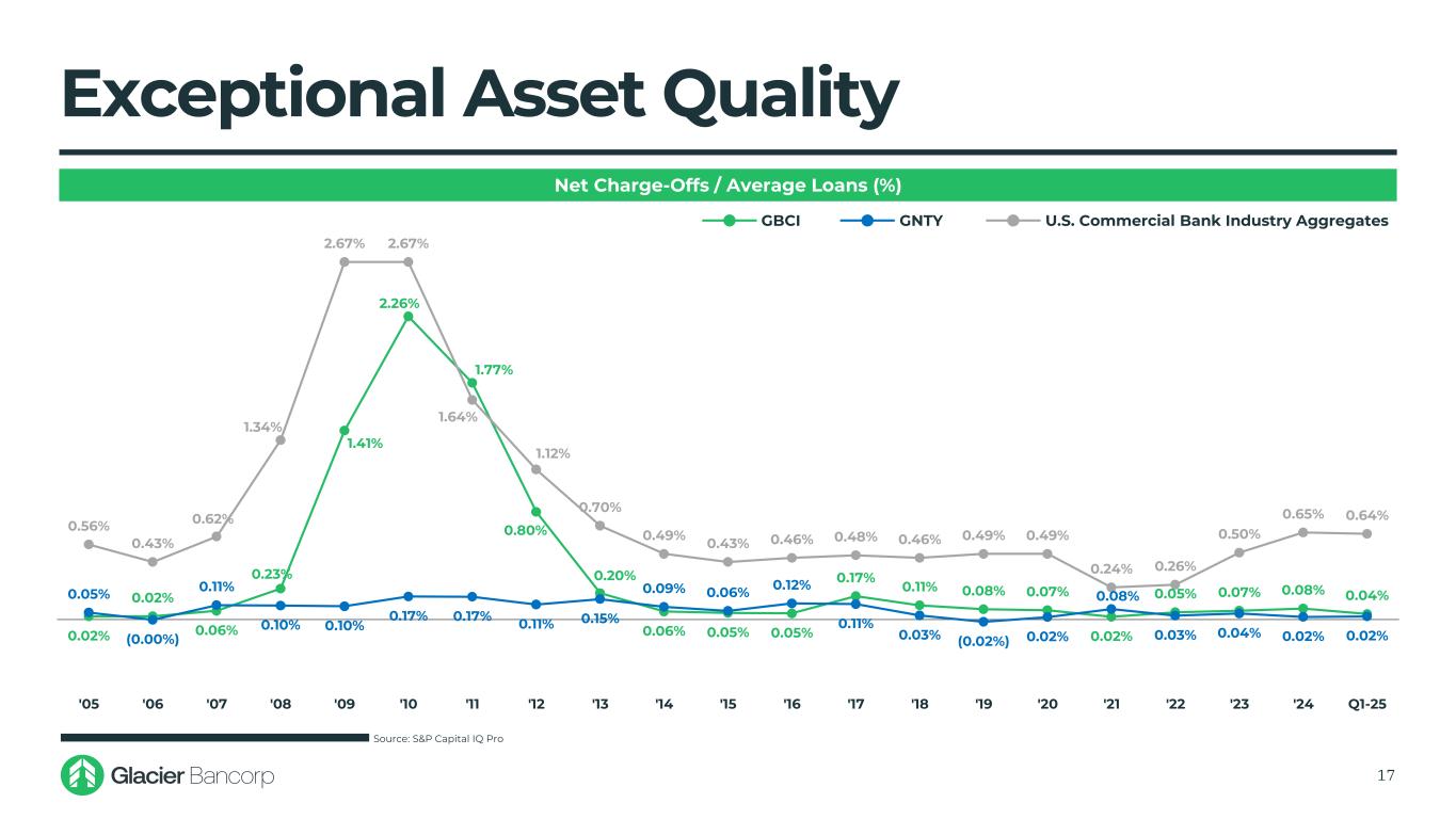 Resi. RE 25.4% C&D 10.7% Multi. 2.4% Non-Own. Occ & Farm 33.6% Own. Occ. 14.0% C&I 10.3% Ag. Prod. 0.6% Cons. & Other 2.9% Resi. RE 20.8% C&D 10.6% Multi. 4.8% Non-Own. Occ & Farm 27.6% Own. Occ. 18.3% C&I 8.6% Ag. Prod. 2.2% Cons. & Other 7.1% Resi. RE 20.3% C&D 10.6% Multi. 5.1% Non-Own. Occ & Farm 26.9% Own. Occ. 18.8% C&I 8.4% Ag. Prod. 2.4% Cons. & Other 7.5% Pro Forma Loan Composition 16 Pro Forma Yield on Loans: 5.84% Yield on Loans: 6.38% Yield on Loans: 5.89% $18.3B $2.1B $20.4B Note: Excludes purchase accounting Note: Loan composition reflects Y-9C regulatory financial information; yield on loans reflects GAAP financial information 1) Glacier reflects pro forma for Bank of Idaho acquisition as of March 31, 2025 (bank-level call report information) Source: S&P Capital IQ Pro (1)