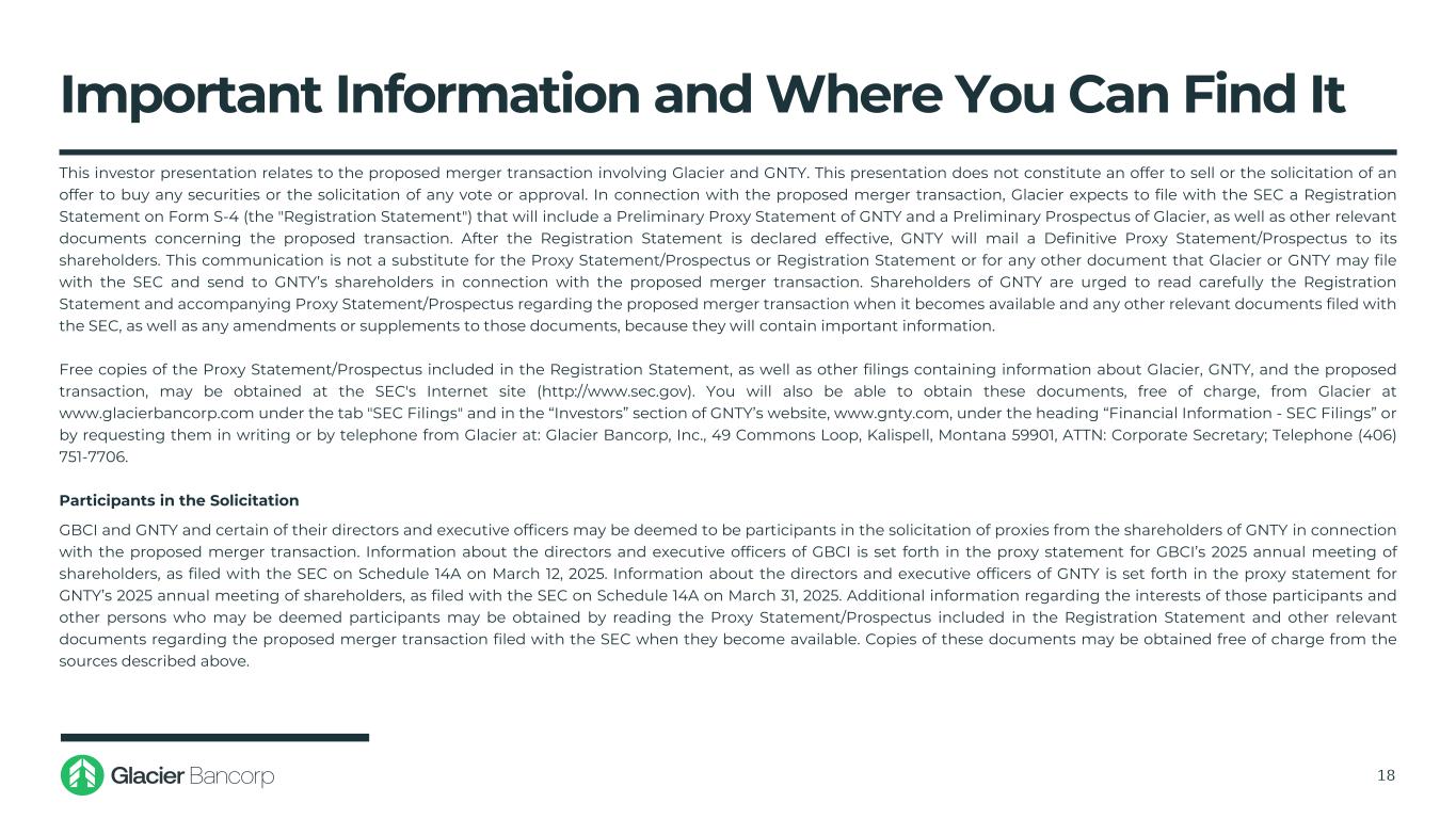 Important Information and Where You Can Find It 18 This investor presentation relates to the proposed merger transaction involving Glacier and GNTY. This presentation does not constitute an offer to sell or the solicitation of an offer to buy any securities or the solicitation of any vote or approval. In connection with the proposed merger transaction, Glacier expects to file with the SEC a Registration Statement on Form S-4 (the "Registration Statement") that will include a Preliminary Proxy Statement of GNTY and a Preliminary Prospectus of Glacier, as well as other relevant documents concerning the proposed transaction. After the Registration Statement is declared effective, GNTY will mail a Definitive Proxy Statement/Prospectus to its shareholders. This communication is not a substitute for the Proxy Statement/Prospectus or Registration Statement or for any other document that Glacier or GNTY may file with the SEC and send to GNTY’s shareholders in connection with the proposed merger transaction. Shareholders of GNTY are urged to read carefully the Registration Statement and accompanying Proxy Statement/Prospectus regarding the proposed merger transaction when it becomes available and any other relevant documents filed with the SEC, as well as any amendments or supplements to those documents, because they will contain important information. Free copies of the Proxy Statement/Prospectus included in the Registration Statement, as well as other filings containing information about Glacier, GNTY, and the proposed transaction, may be obtained at the SEC's Internet site (http://www.sec.gov). You will also be able to obtain these documents, free of charge, from Glacier at www.glacierbancorp.com under the tab "SEC Filings" and in the “Investors” section of GNTY’s website, www.gnty.com, under the heading “Financial Information - SEC Filings” or by requesting them in writing or by telephone from Glacier at: Glacier Bancorp, Inc., 49 Commons Loop, Kalispell, Montana 59901, ATTN: Corporate Secretary; Telephone (406) 751-7706. Participants in the Solicitation GBCI and GNTY and certain of their directors and executive officers may be deemed to be participants in the solicitation of proxies from the shareholders of GNTY in connection with the proposed merger transaction. Information about the directors and executive officers of GBCI is set forth in the proxy statement for GBCI’s 2025 annual meeting of shareholders, as filed with the SEC on Schedule 14A on March 12, 2025. Information about the directors and executive officers of GNTY is set forth in the proxy statement for GNTY’s 2025 annual meeting of shareholders, as filed with the SEC on Schedule 14A on March 31, 2025. Additional information regarding the interests of those participants and other persons who may be deemed participants may be obtained by reading the Proxy Statement/Prospectus included in the Registration Statement and other relevant documents regarding the proposed merger transaction filed with the SEC when they become available. Copies of these documents may be obtained free of charge from the sources described above.