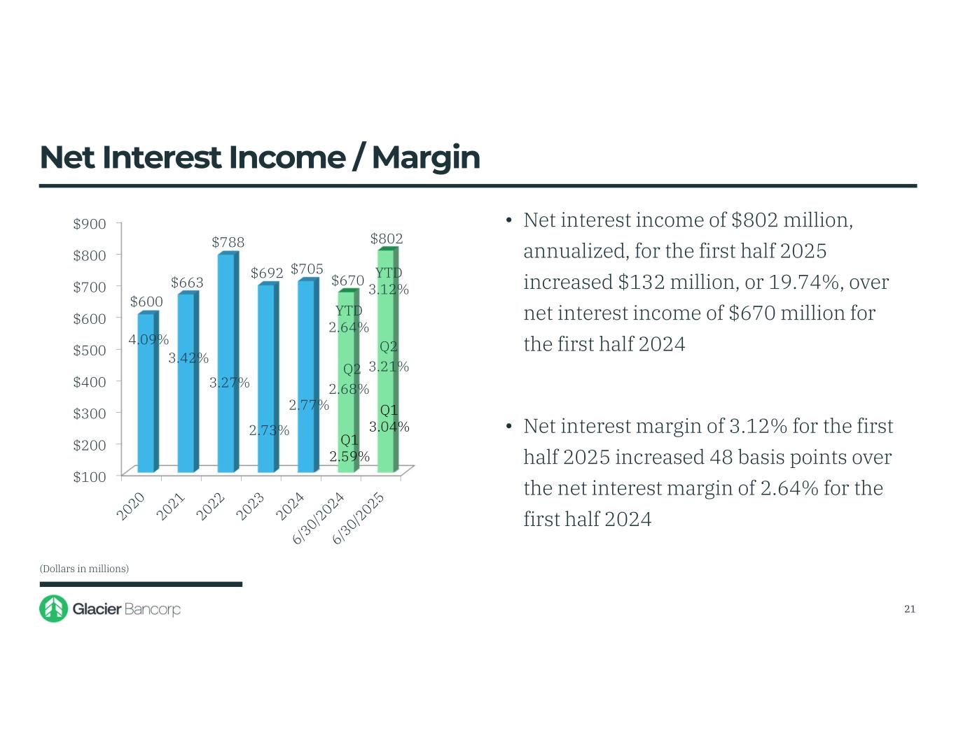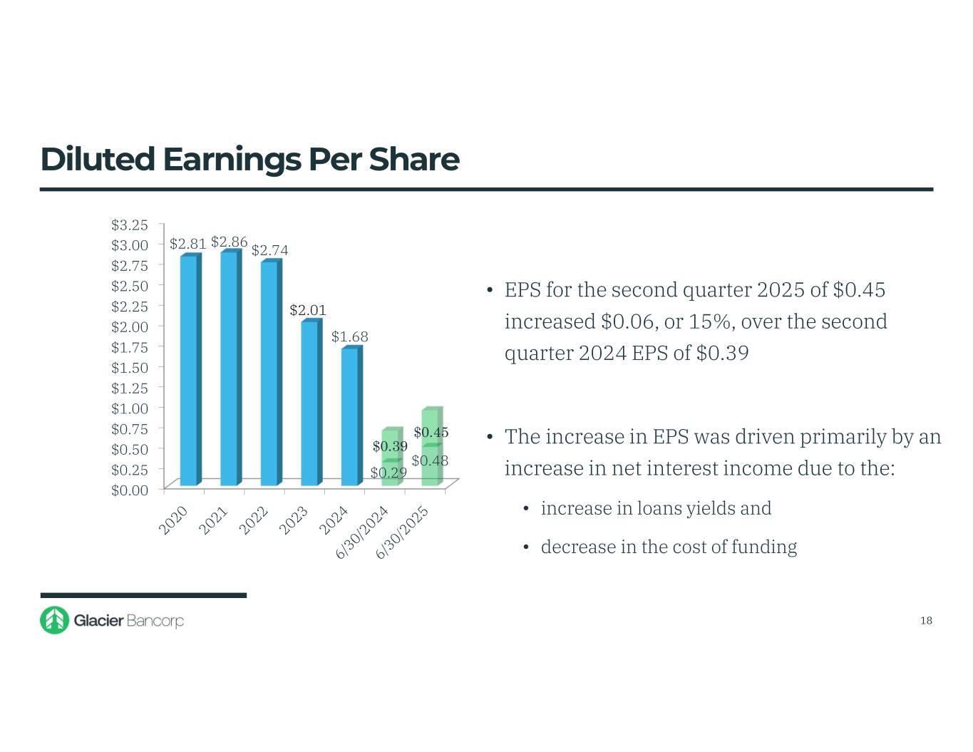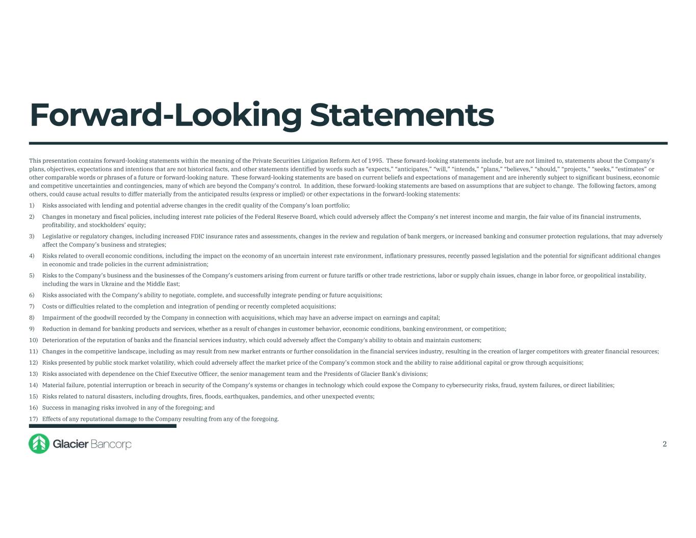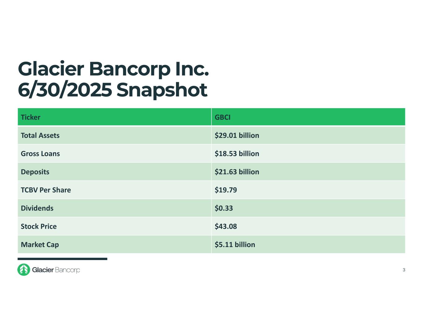 Forward-Looking Statements This presentation contains forward-looking statements within the meaning of the Private Securities Litigation Reform Act of 1995. These forward-looking statements include, but are not limited to, statements about the Company’s plans, objectives, expectations and intentions that are not historical facts, and other statements identified by words such as “expects,” “anticipates,” “will,” “intends,” “plans,” “believes,” “should,” “projects,” “seeks,” “estimates” or other comparable words or phrases of a future or forward-looking nature. These forward-looking statements are based on current beliefs and expectations of management and are inherently subject to significant business, economic and competitive uncertainties and contingencies, many of which are beyond the Company’s control. In addition, these forward-looking statements are based on assumptions that are subject to change. The following factors, among others, could cause actual results to differ materially from the anticipated results (express or implied) or other expectations in the forward-looking statements: 1) Risks associated with lending and potential adverse changes in the credit quality of the Company’s loan portfolio; 2) Changes in monetary and fiscal policies, including interest rate policies of the Federal Reserve Board, which could adversely affect the Company’s net interest income and margin, the fair value of its financial instruments, profitability, and stockholders’ equity; 3) Legislative or regulatory changes, including increased FDIC insurance rates and assessments, changes in the review and regulation of bank mergers, or increased banking and consumer protection regulations, that may adversely affect the Company’s business and strategies; 4) Risks related to overall economic conditions, including the impact on the economy of an uncertain interest rate environment, inflationary pressures, recently passed legislation and the potential for significant additional changes in economic and trade policies in the current administration; 5) Risks to the Company’s business and the businesses of the Company’s customers arising from current or future tariffs or other trade restrictions, labor or supply chain issues, change in labor force, or geopolitical instability, including the wars in Ukraine and the Middle East; 6) Risks associated with the Company’s ability to negotiate, complete, and successfully integrate pending or future acquisitions; 7) Costs or difficulties related to the completion and integration of pending or recently completed acquisitions; 8) Impairment of the goodwill recorded by the Company in connection with acquisitions, which may have an adverse impact on earnings and capital; 9) Reduction in demand for banking products and services, whether as a result of changes in customer behavior, economic conditions, banking environment, or competition; 10) Deterioration of the reputation of banks and the financial services industry, which could adversely affect the Company's ability to obtain and maintain customers; 11) Changes in the competitive landscape, including as may result from new market entrants or further consolidation in the financial services industry, resulting in the creation of larger competitors with greater financial resources; 12) Risks presented by public stock market volatility, which could adversely affect the market price of the Company’s common stock and the ability to raise additional capital or grow through acquisitions; 13) Risks associated with dependence on the Chief Executive Officer, the senior management team and the Presidents of Glacier Bank’s divisions; 14) Material failure, potential interruption or breach in security of the Company’s systems or changes in technology which could expose the Company to cybersecurity risks, fraud, system failures, or direct liabilities; 15) Risks related to natural disasters, including droughts, fires, floods, earthquakes, pandemics, and other unexpected events; 16) Success in managing risks involved in any of the foregoing; and 17) Effects of any reputational damage to the Company resulting from any of the foregoing. 2