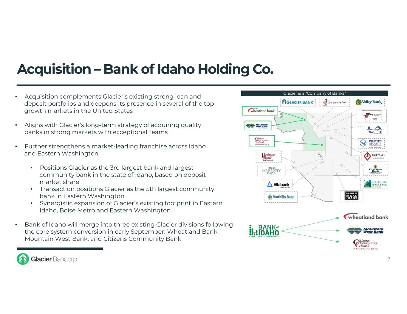 Acquisition – Bank of Idaho Holding Co. • Founded in 1985 and headquartered in Idaho Falls, Idaho • Full-service community bank, providing comprehensive financial services to businesses and individuals with 15 branch locations throughout Eastern Idaho, Boise Metro and Eastern Washington • Acquisition closed April 30, 2025 6